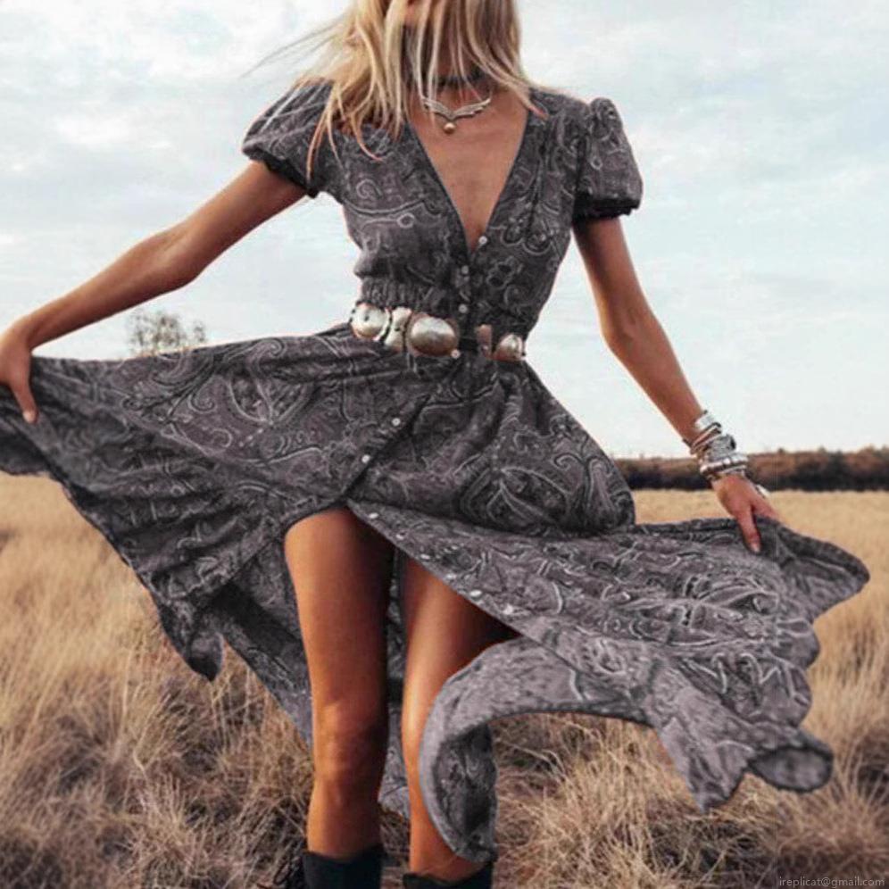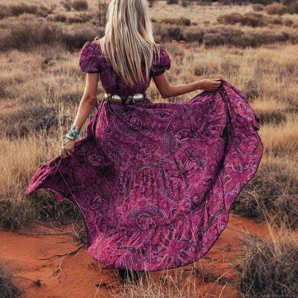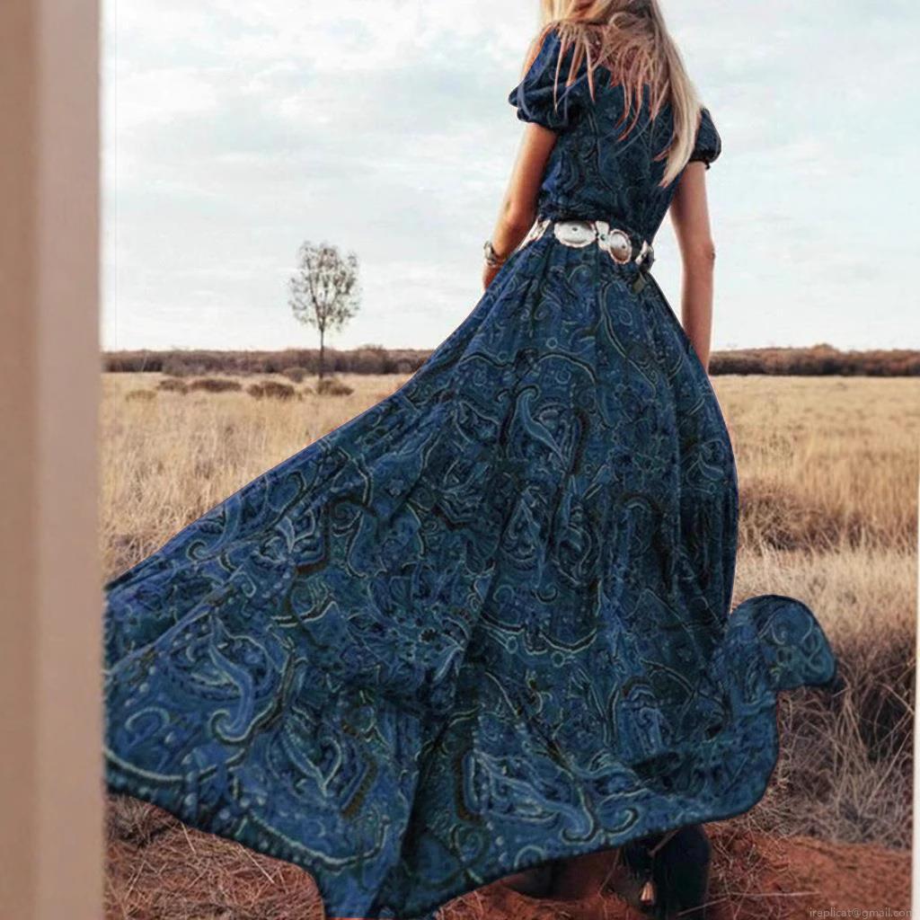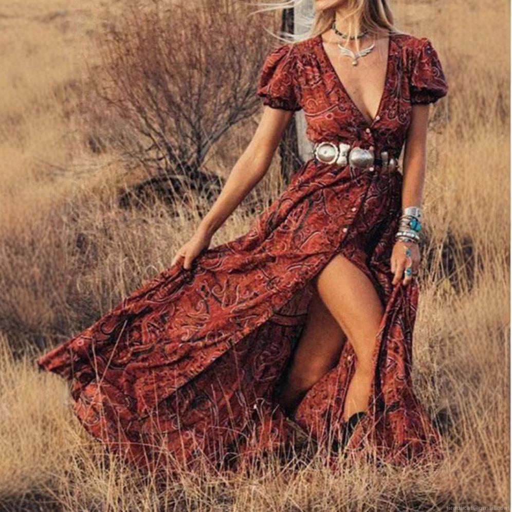 • Women Bohemian Maxi Dress Paisley Floral Print V Neck Puff Sleeve Button Up Front Slit Flowy Vacation Long Dress Vintage Ethnic Style
