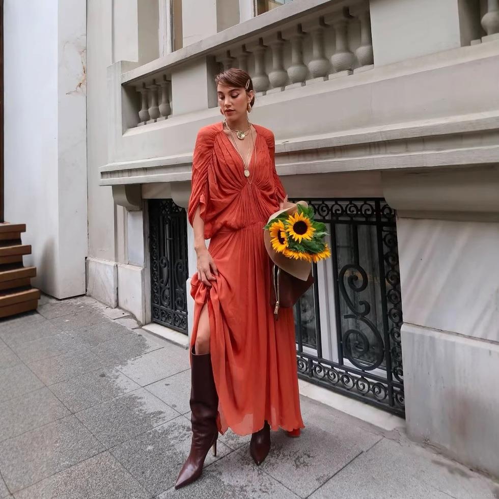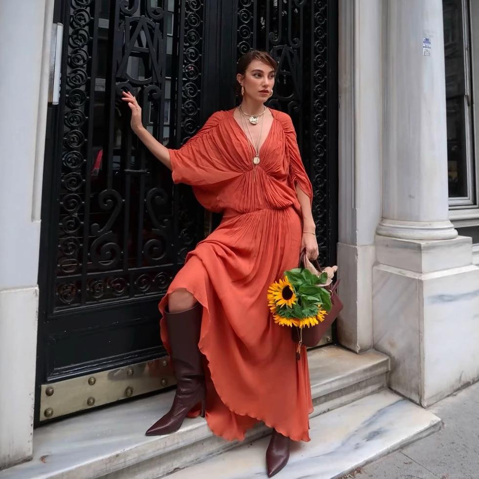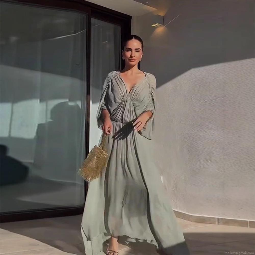 • Women Bohemian Maxi Dress V-Neck Pleated Batwing Sleeve Loose Solid Color Elegant Two Piece Set Summer Beach Vacation Party Long Gown