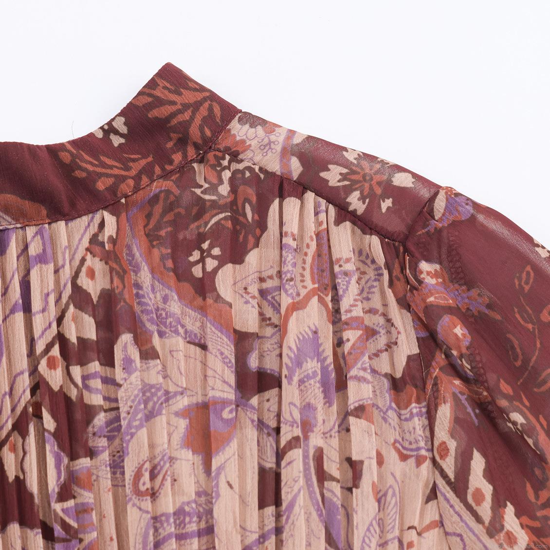 • Women Bohemian Paisley Print Maxi Dress Wine Red Viscose Chiffon Pleated Long Sleeve Stand Collar High Waist A-Line Long Swing Dress For Vacation Daily Wear