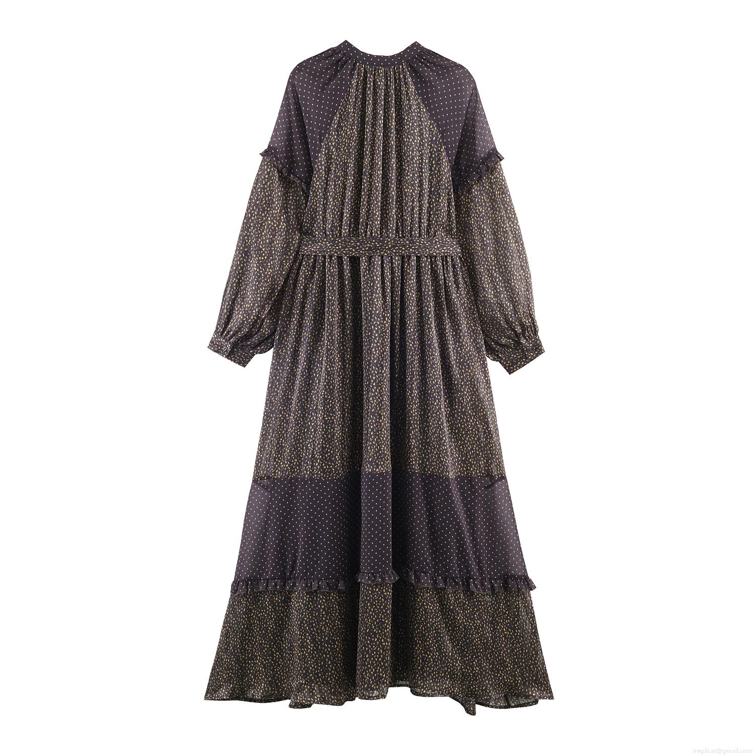 • Women Bohemian Polka Dot Maxi Dress Elegant Long Sleeve Ruffled Swing Dress With Waist Tie Polyester Metallic Dot Long Dress For Banquet Party