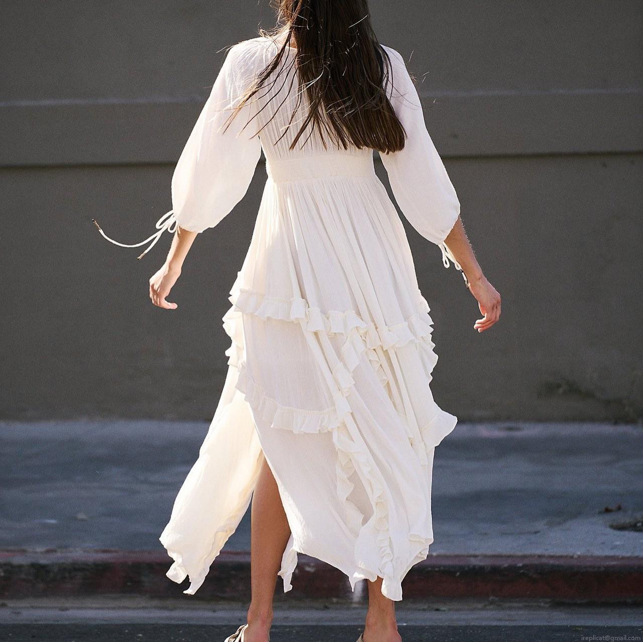 • Women Bohemian Ruffle Tiered Maxi Dress Solid Color Square Neck Lantern Long Sleeve Smocked High Waist Split Flowy Vacation Dress