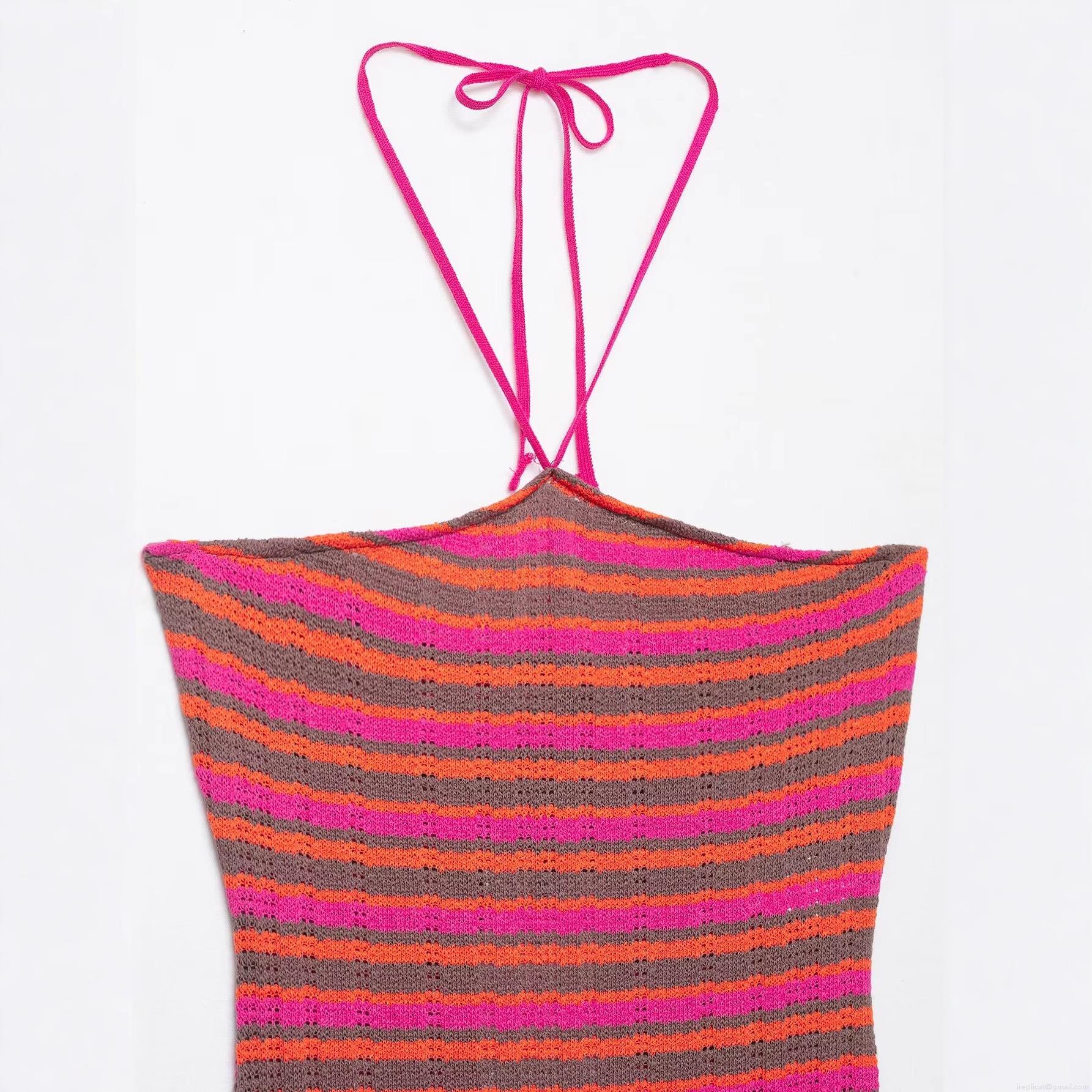 • Women Bohemian Striped Crochet Halter Maxi Dress Sexy Backless Hollow Out Knitted Bodycon Long Dress For Summer Vacation Beach Party Clubwear