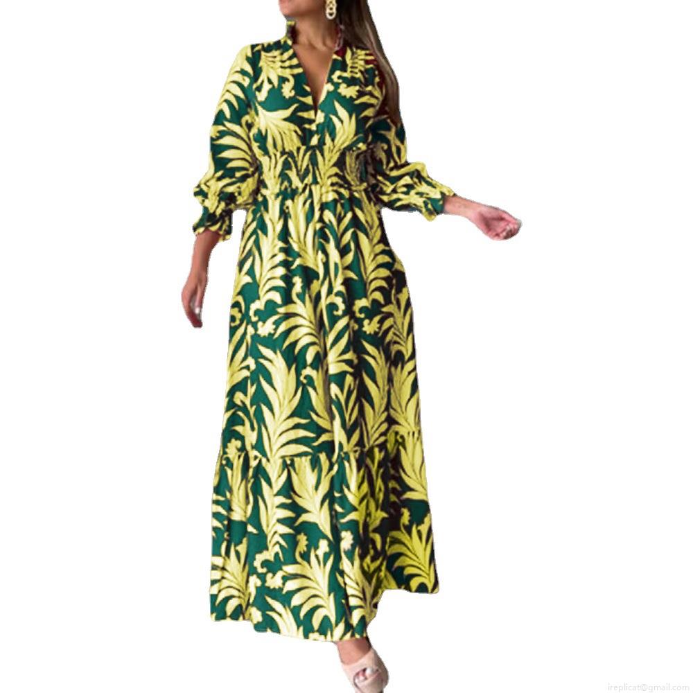 • Women Bohemian Tropical Leaf Print Maxi Dress V-Neck Elastic Waist Long Sleeve Ruffle Hem Casual Vacation Retro Flowy Long Dresses