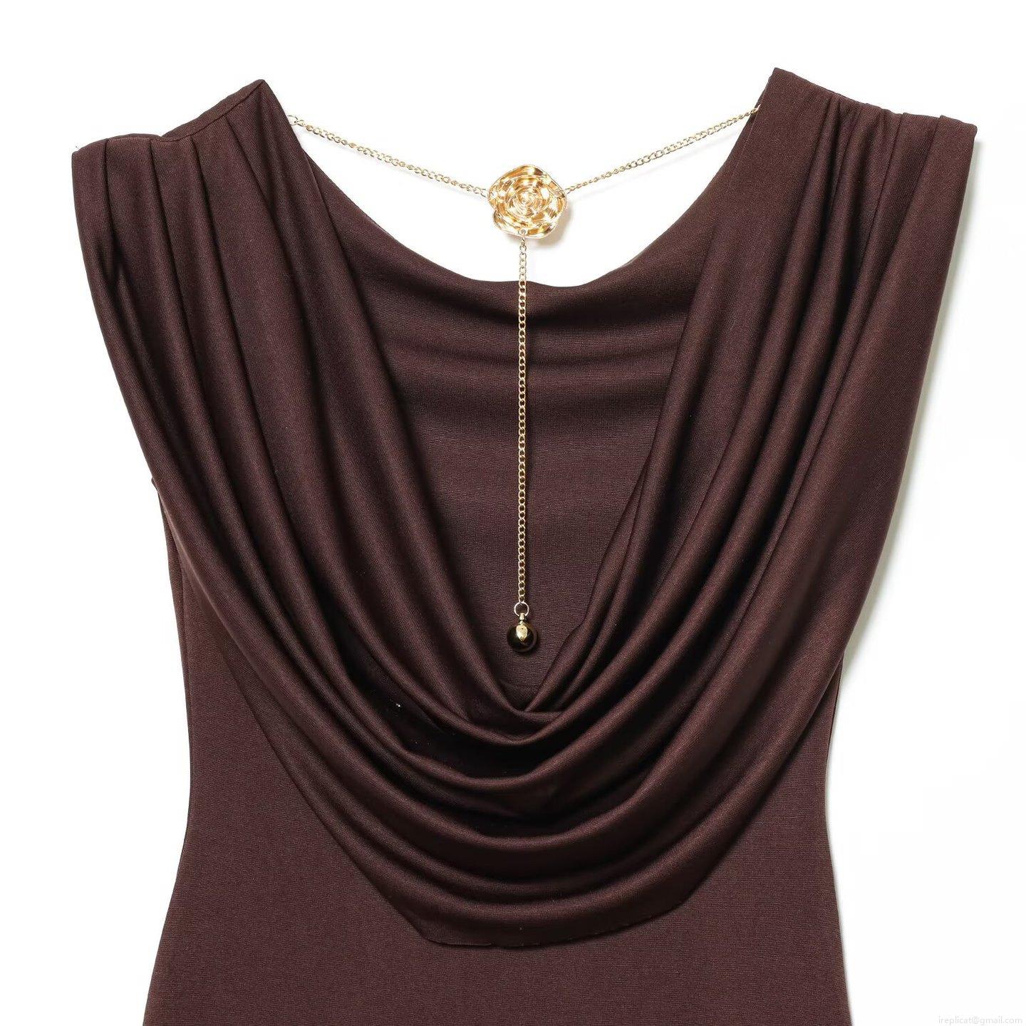 Women Cowl Neck Backless Maxi Dress With Gold Rose Chain Detail Sexy Sleeveless Bodycon Stretch Long Dress Elegant Party Evening Clubwear Solid Coffee