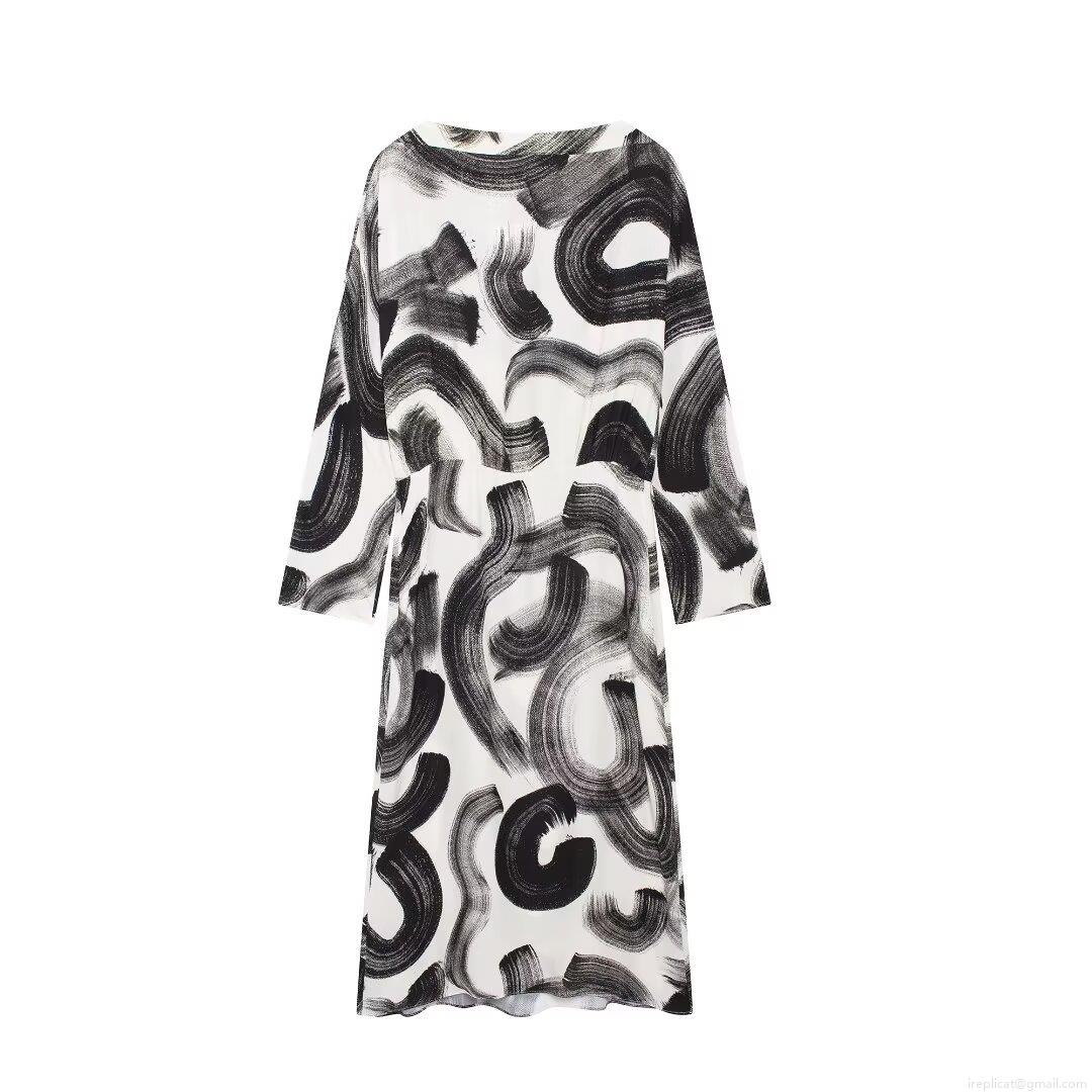 Women Elegant 100% Polyester Maxi Dress Abstract Black White Brushstroke Print Round Neck Long Sleeve Loose Fit Casual Artistic Retro Long Skirt For Party Holiday