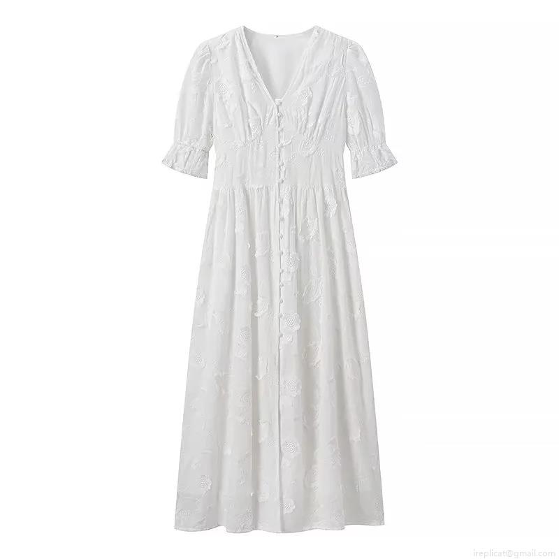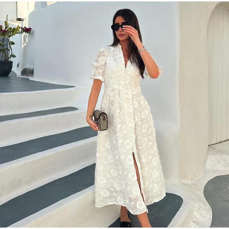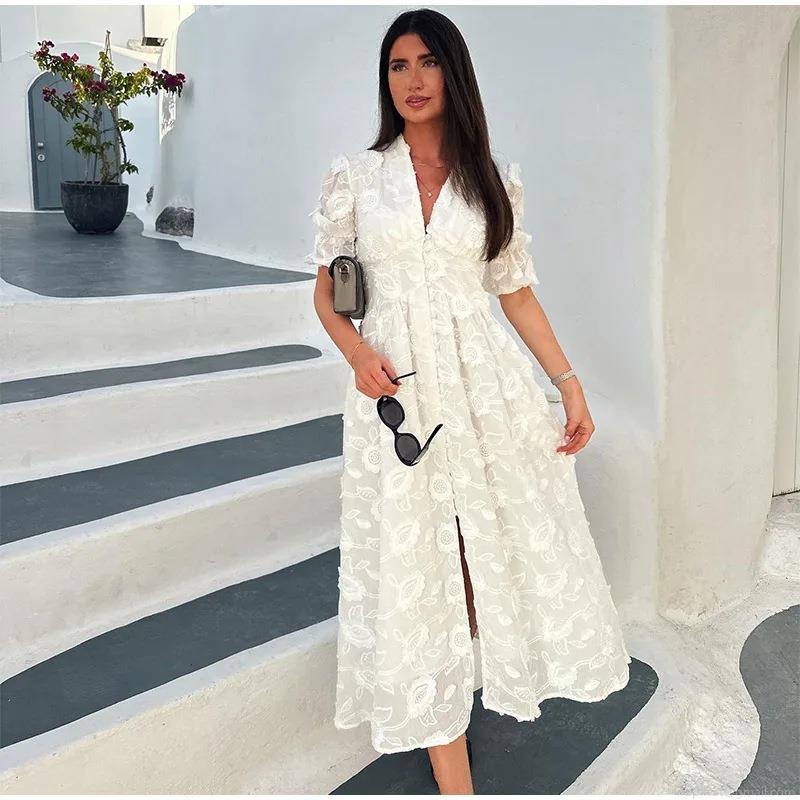 • Women Elegant 3D Floral Embroidery Maxi Dress V-Neck Puff Sleeve Single Breasted Lace Mesh Romantic Beach Holiday Summer Resort Long Dress