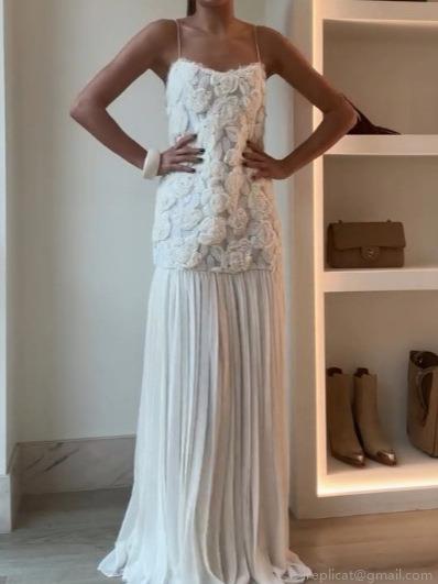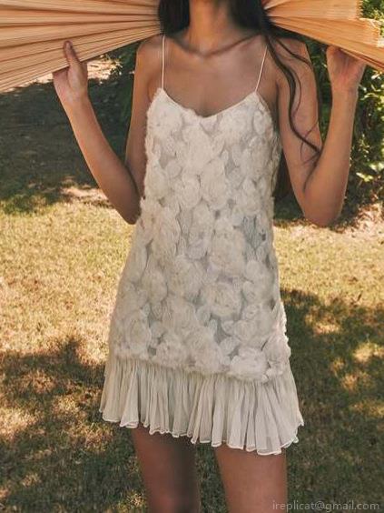 • Women Elegant 3D Flower Spaghetti Strap V-Neck Lace Patchwork Flowing A-Line Dress White Maxi Short Party Vacation Chic Sleeveless Gown