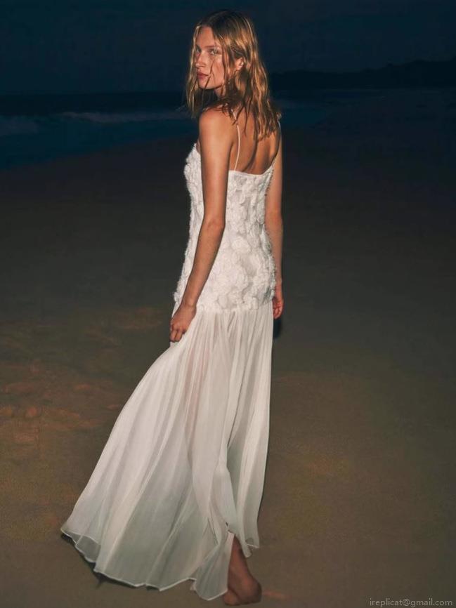Women Elegant 3D Flower Spaghetti Strap V-Neck Lace Patchwork Flowing A-Line Dress White Maxi Short Party Vacation Chic Sleeveless Gown