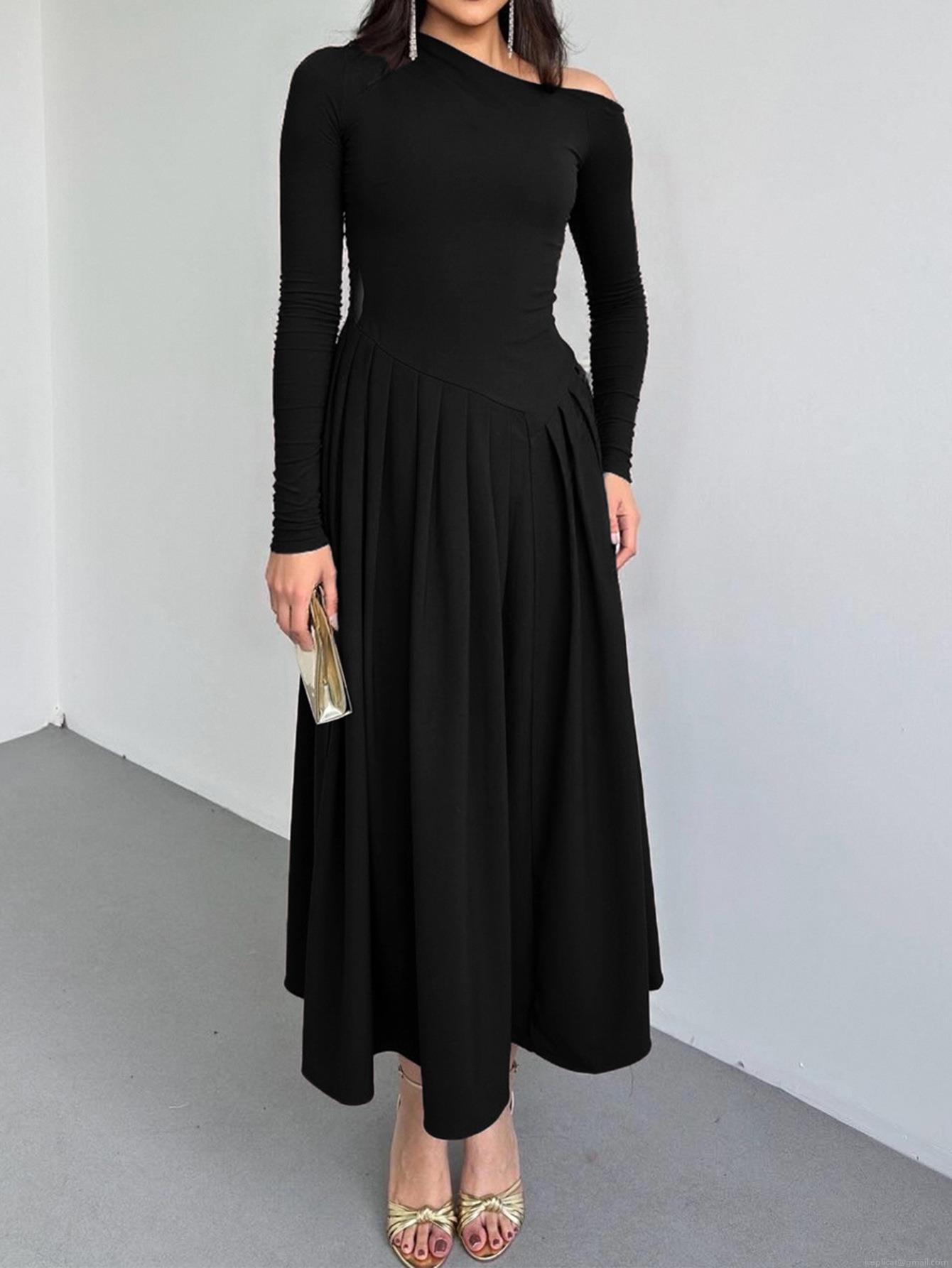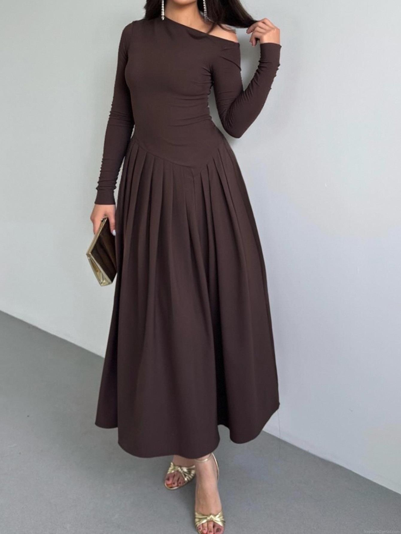 • Women Elegant Asymmetric Off Shoulder Maxi Dress Sexy Long Sleeve High Waist Pleated A-Line Knit Dress For Party Wedding Cocktail Evening