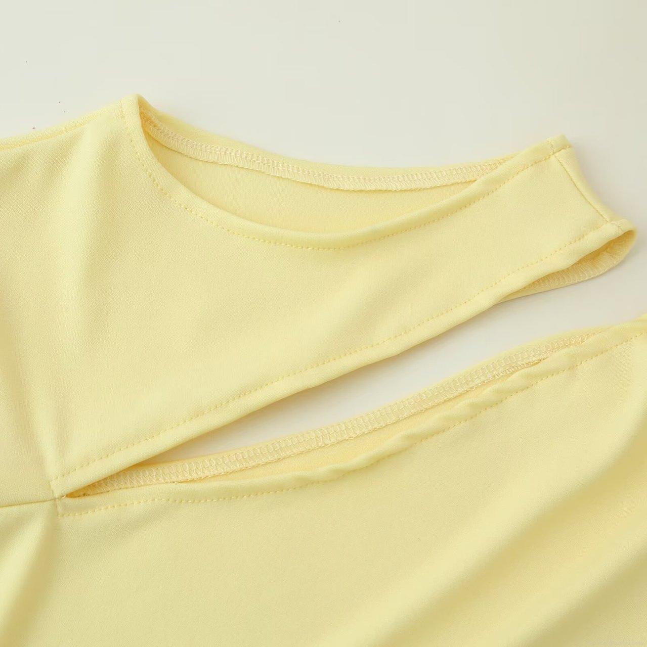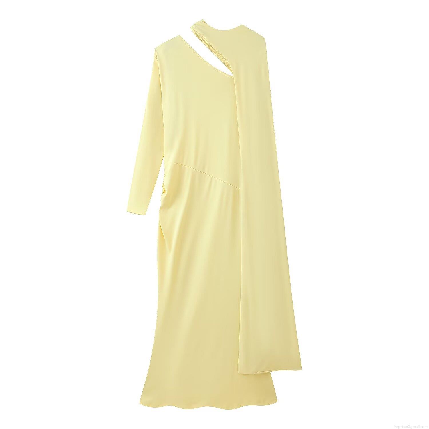 • Women Elegant Asymmetric Pleated Cape Maxi Dress Cutout Shoulder Long Sleeve Draped Polyester Spandex Bodycon Party Evening Dress Solid Yellow Pink