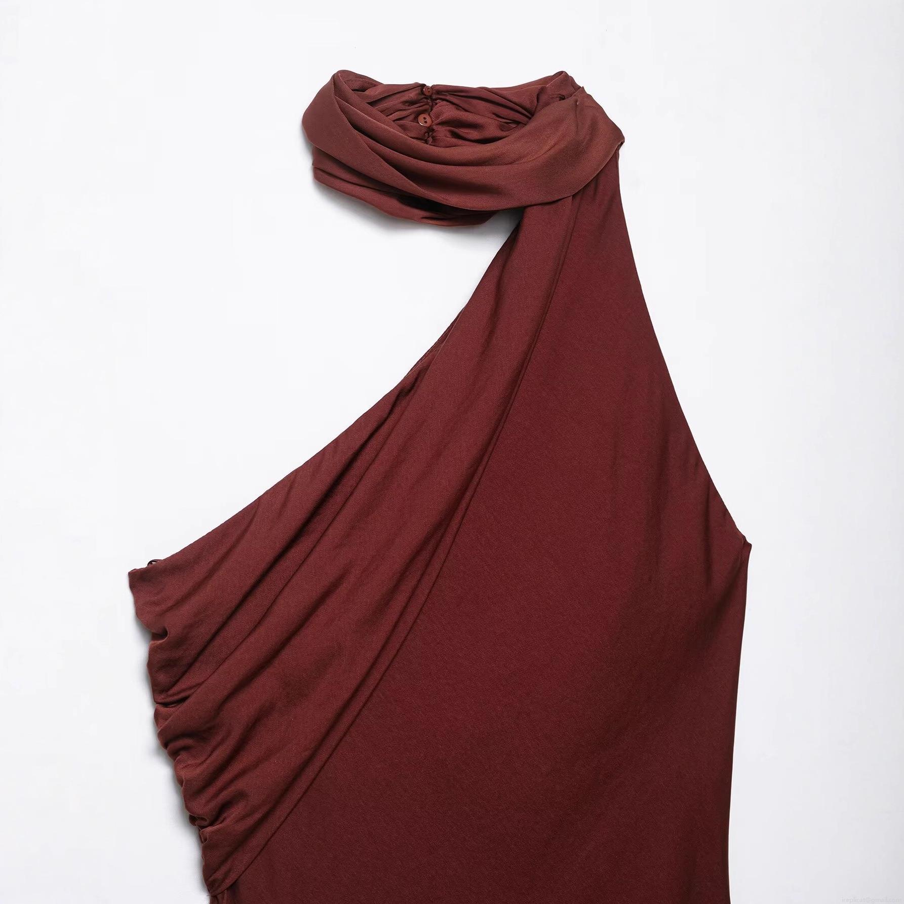 • Women Elegant Asymmetric Satin Halter Maxi Dress With Scarf Collar Off-Shoulder Sleeveless Pleated Solid Color Evening Party Long Dress