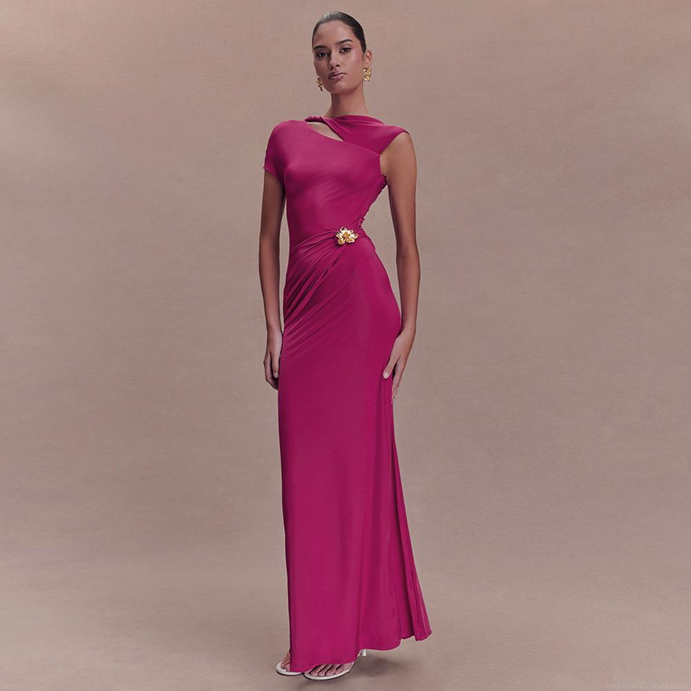 Solid Color, Backless, High-waisted Pleats, Asymmetrical Cutout Neckline, Gold Three-dimensional Floral Ornament
