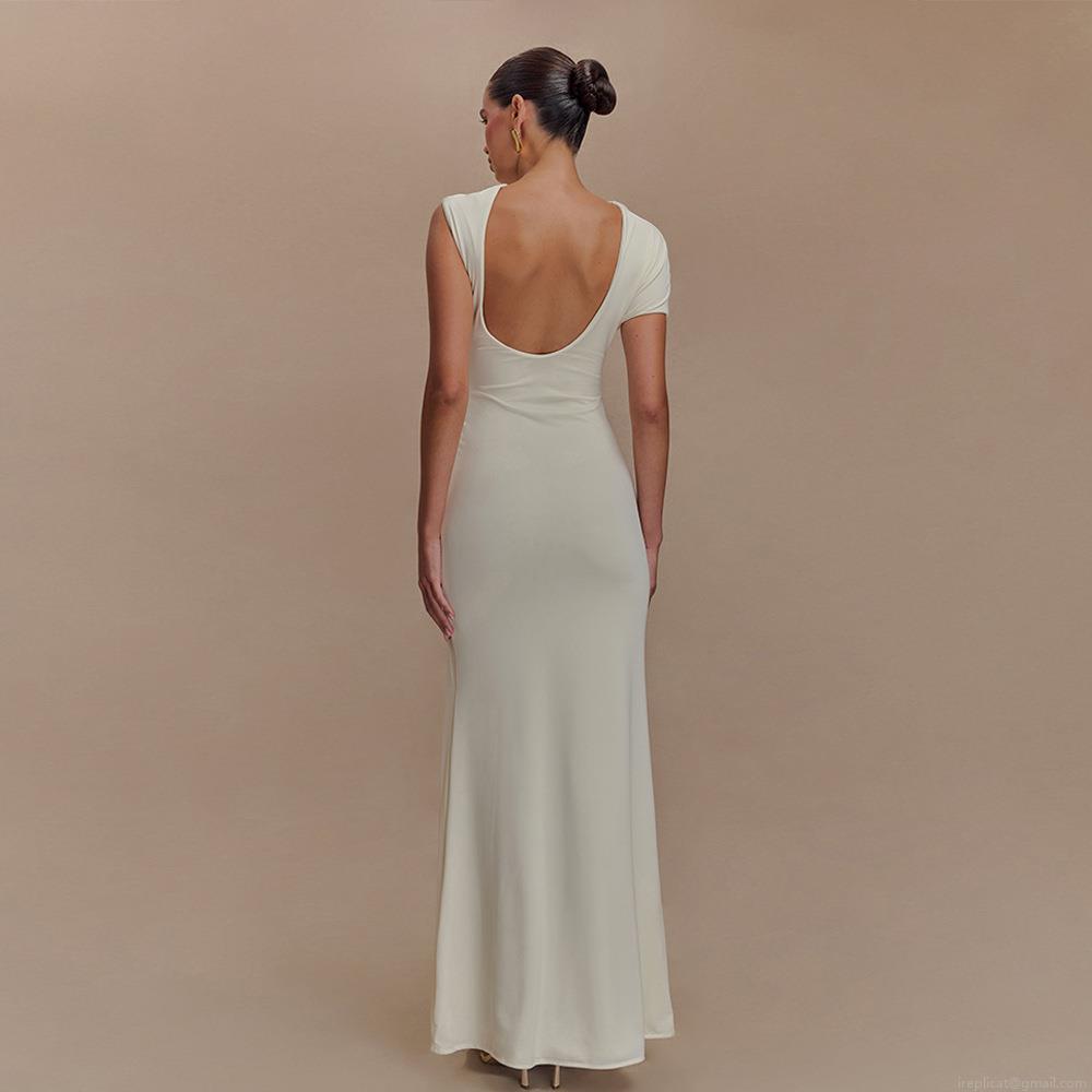 • Women Elegant Backless Maxi Dress Slim Fit Polyester Milk Silk One Shoulder Evening Gown With Golden Flower Brooch For Summer Party Ladies