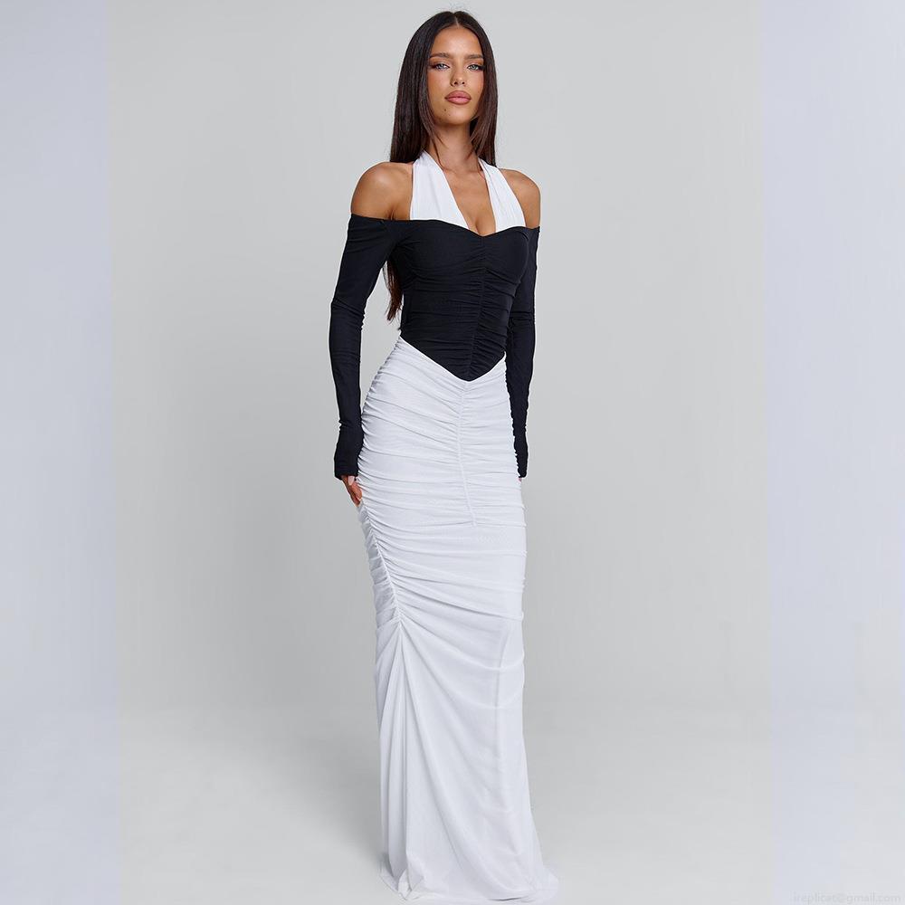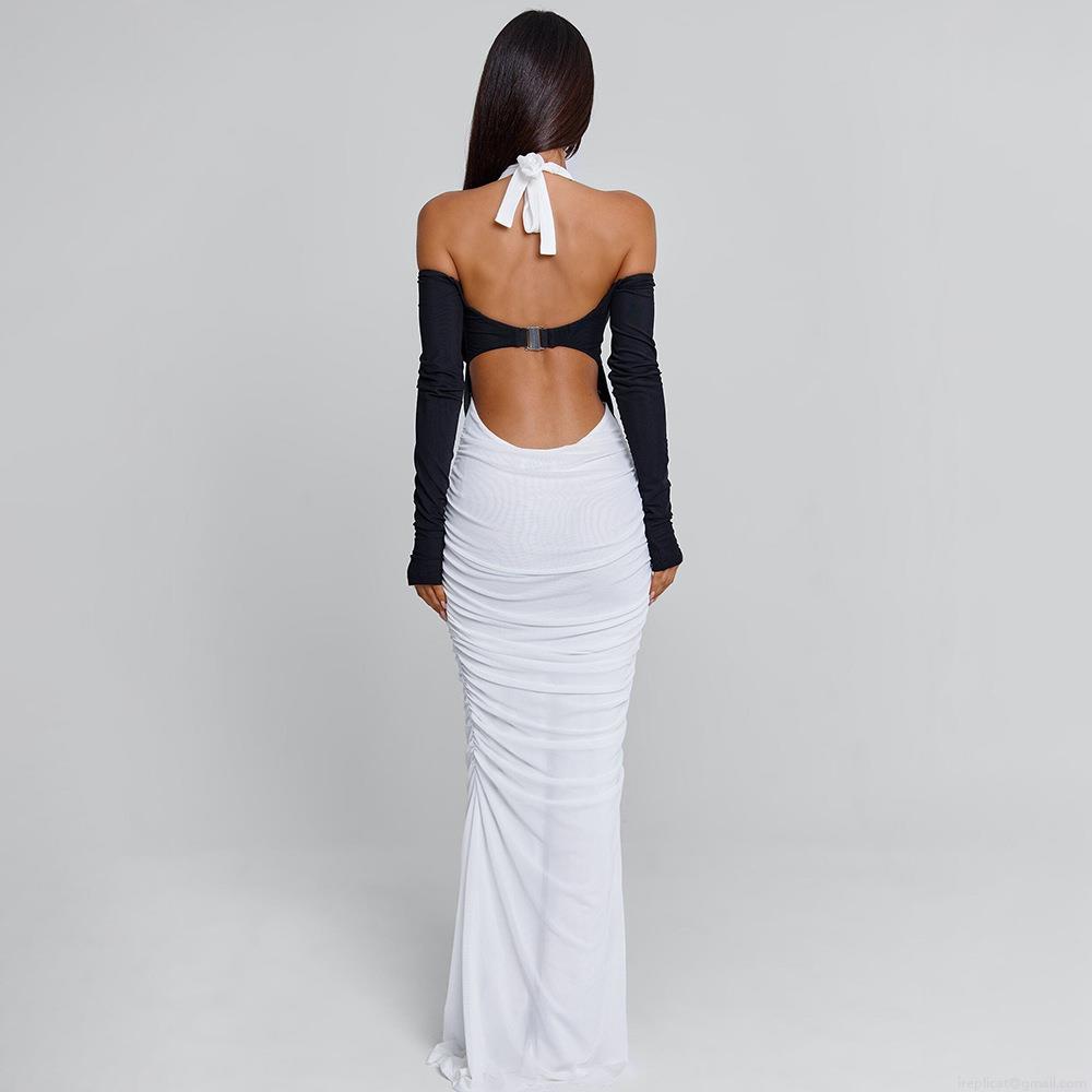 Women Elegant Black and White Contrast Halter Maxi Dress Sexy Backless Ruched Bodycon Party Long Dress with Long Sleeves Polyester Mesh Milk Silk
