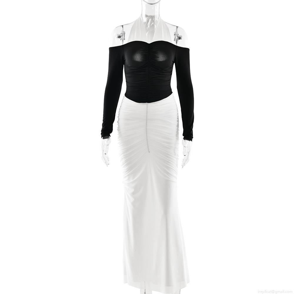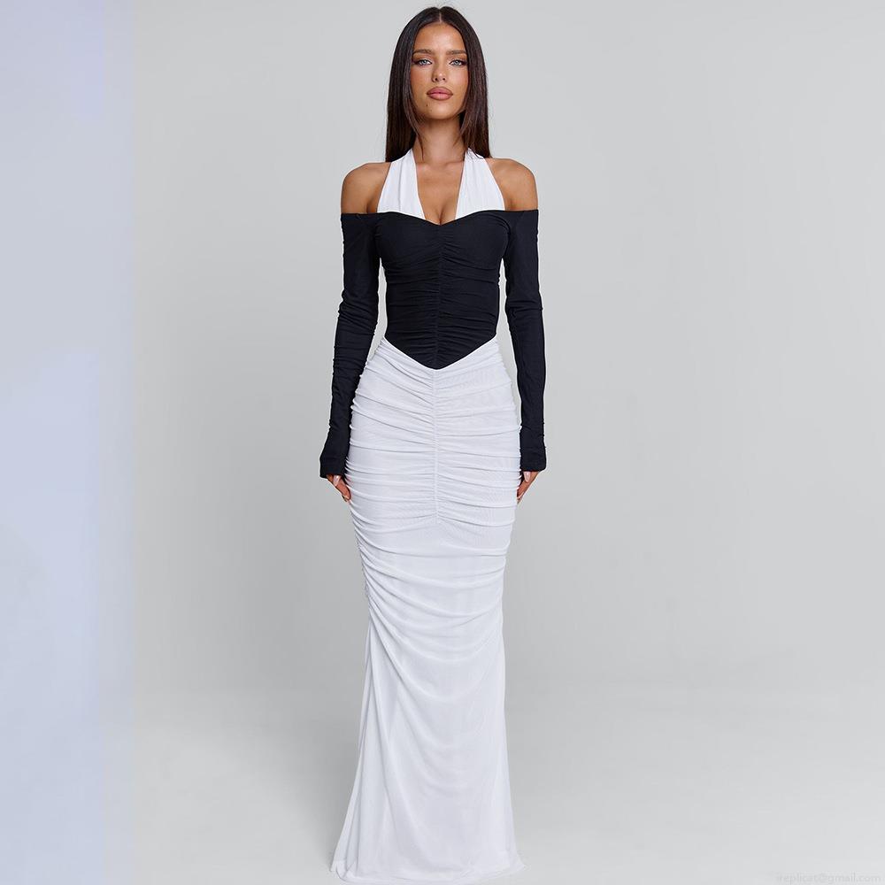 • Women Elegant Black and White Contrast Halter Maxi Dress Sexy Backless Ruched Bodycon Party Long Dress with Long Sleeves Polyester Mesh Milk Silk