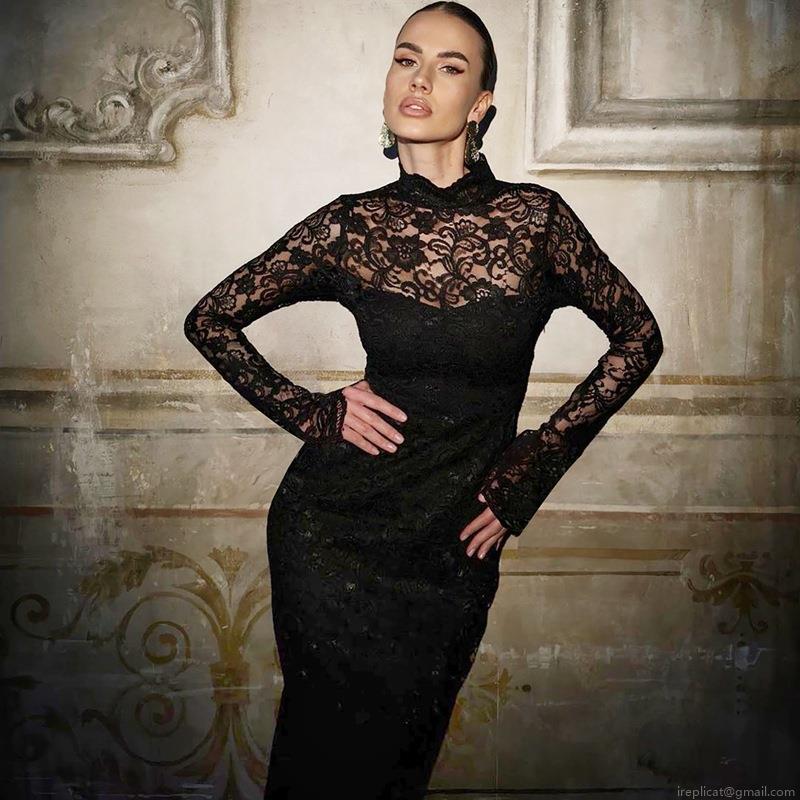 Women Elegant Black Lace Maxi Dress Sexy See-Through Long Sleeve High Neck Bodycon Party Dress Luxury Polyester Spandex Patchwork Mesh Gown
