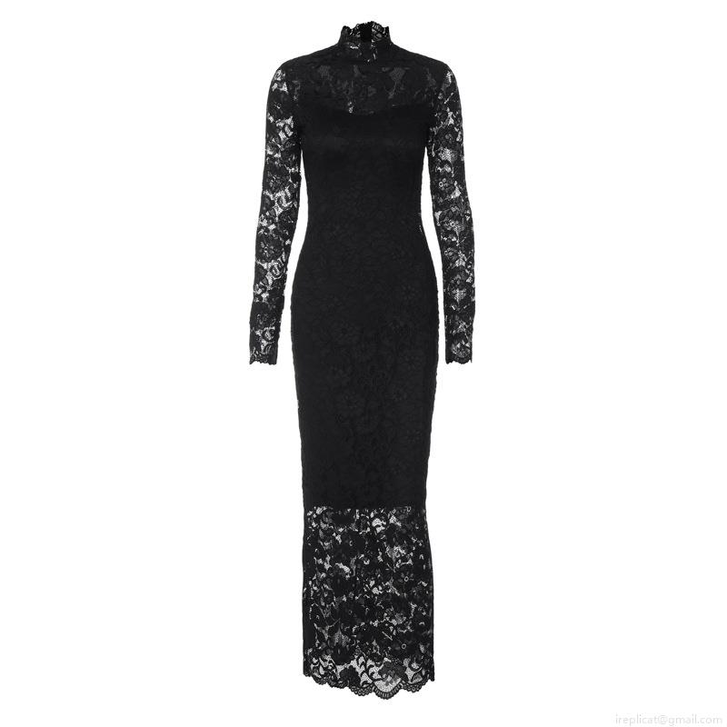 • Women Elegant Black Lace Maxi Dress Sexy See-Through Long Sleeve High Neck Bodycon Party Dress Luxury Polyester Spandex Patchwork Mesh Gown