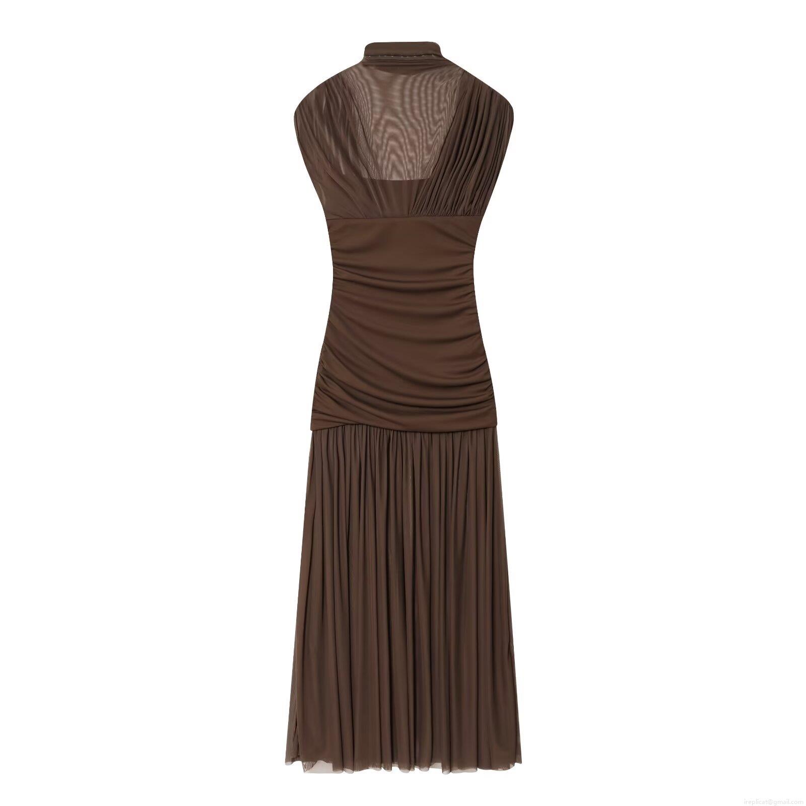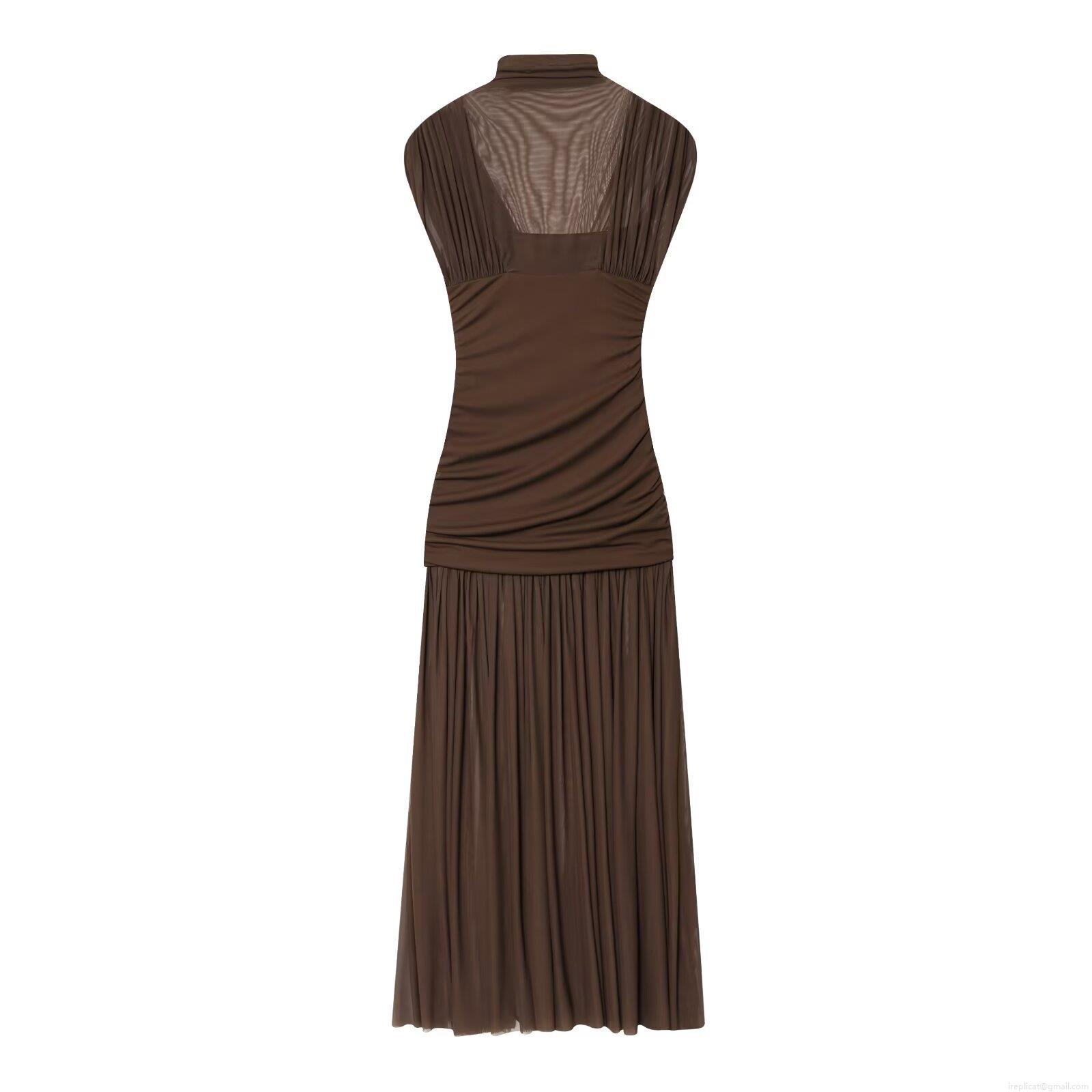 • Women Elegant Coffee Mesh Splicing Ruched Maxi Dress Sleeveless Mock Neck Slim Fit Pleated Bodycon Long Dress For Party Club Night Out Summer Clothing