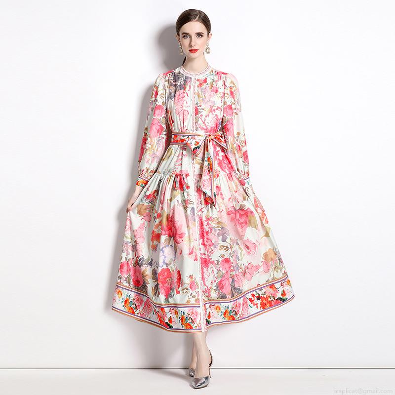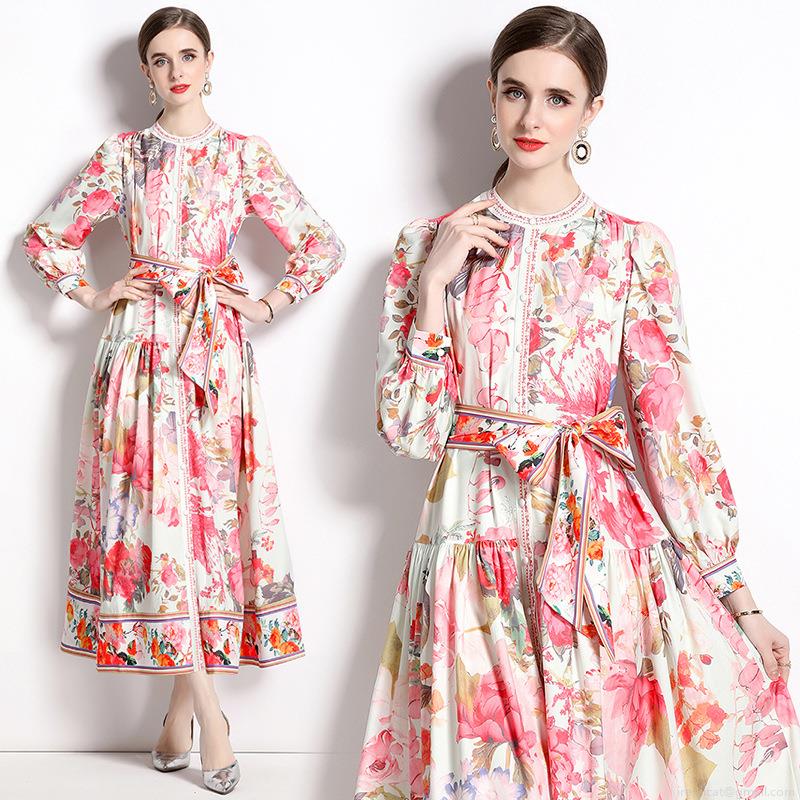 • Women Elegant Floral Print Maxi Dress Polyester Fabric Single Breasted Round Neck Long Sleeve With Belt For Vacation Holiday Office Daily Wear Flowy Swing Hem