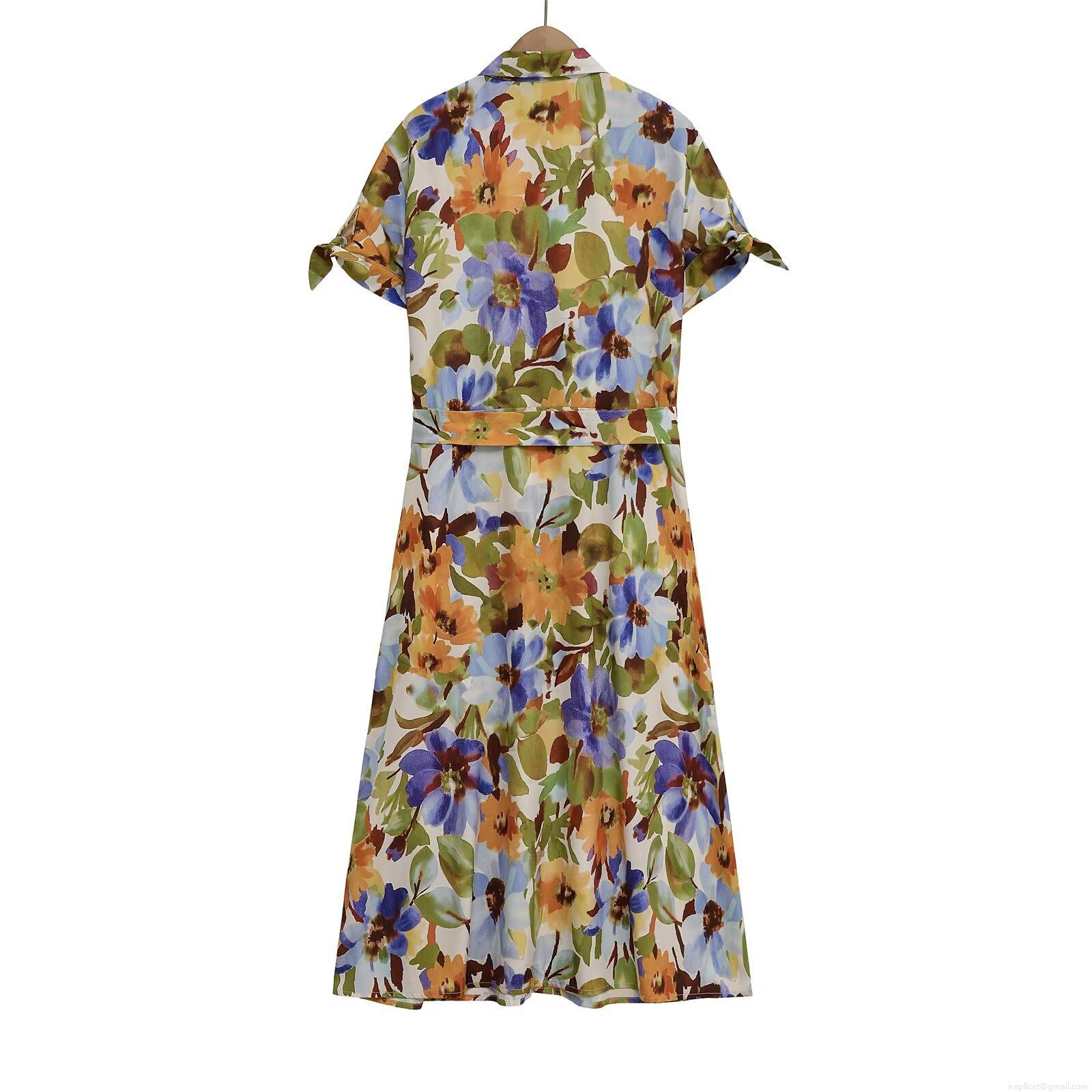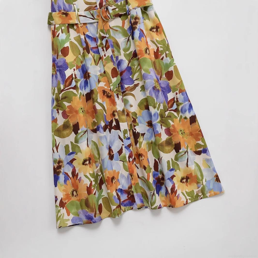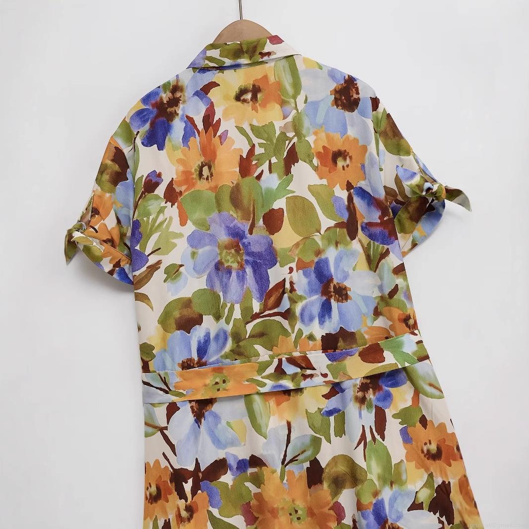 • Women Elegant Floral Print Maxi Dress Short Sleeve Shirt Collar Single Breasted Belted Polyester Dress For Summer Party Daily Wear
