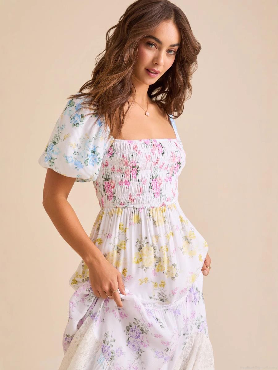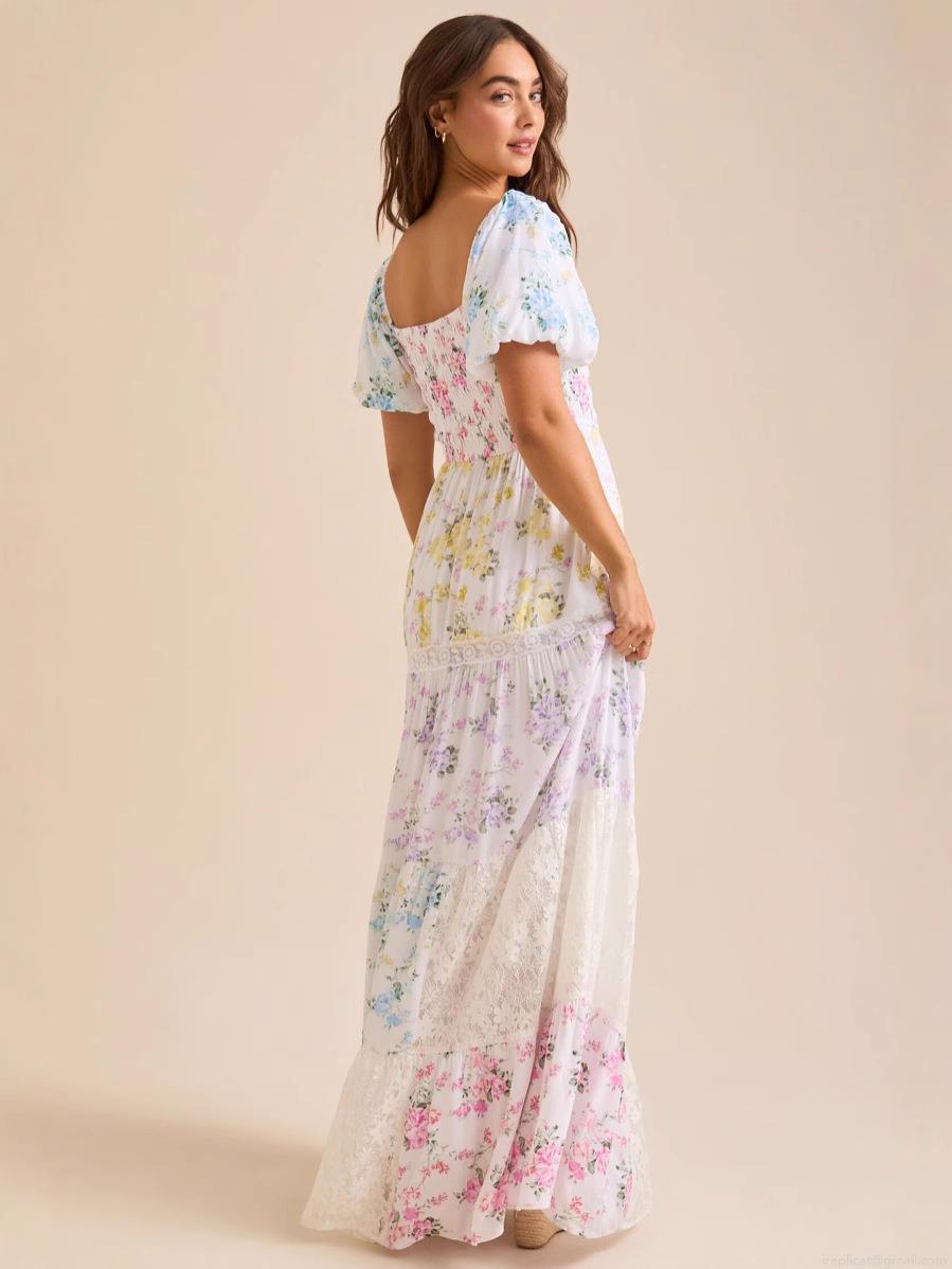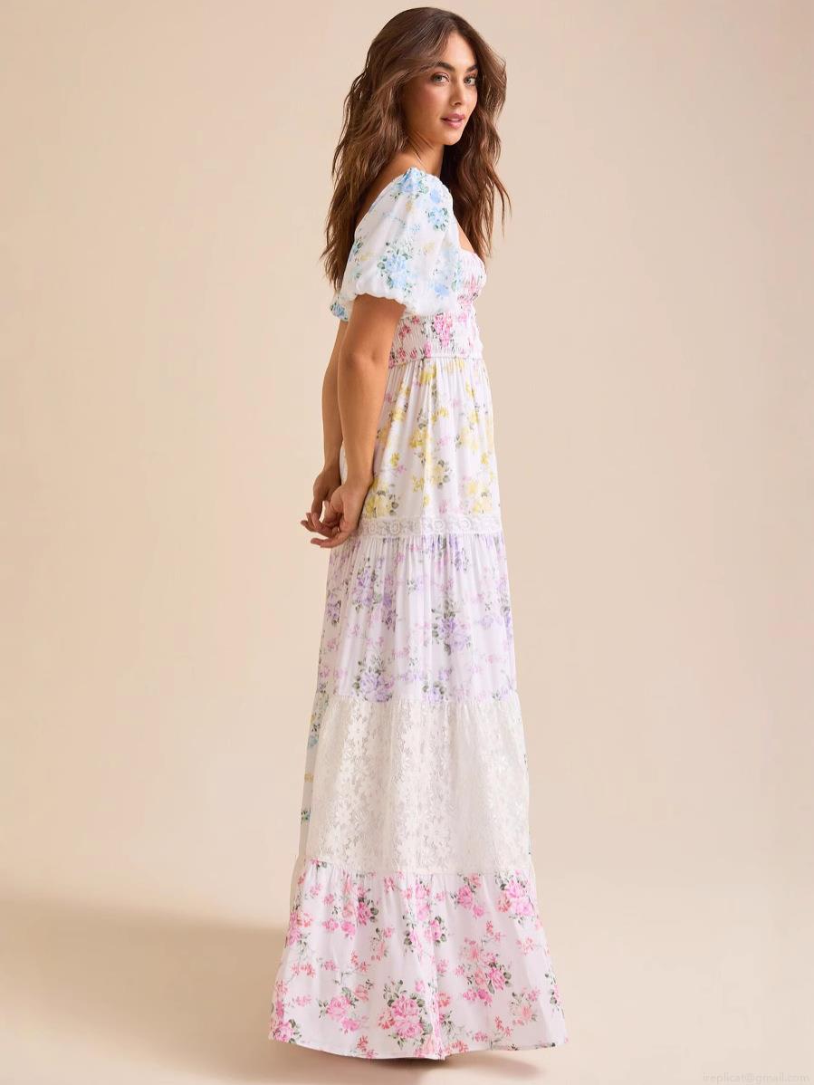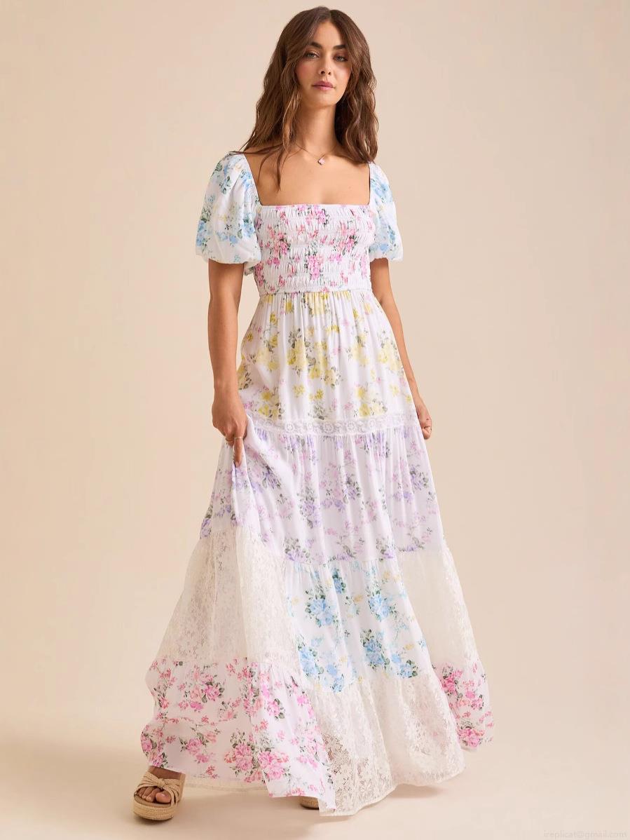 • Women Elegant Floral Print Polyester Maxi Dress With Lace Patchwork Puff Sleeve Square Neck Smocked High Waist Tiered Long Dress For Vacation Casual Lady