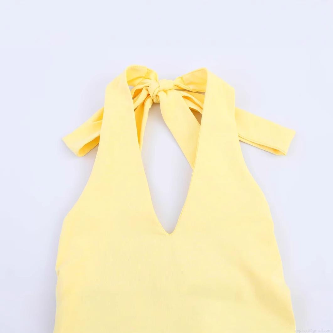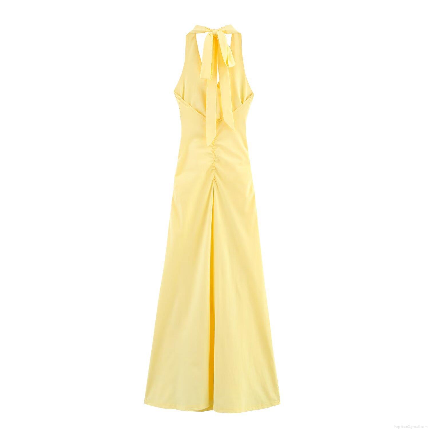 • Women Elegant Halter Neck Maxi Dress Solid Yellow Ruched V-Neck Backless Sleeveless Party Dress Polyester Socialite Style Long Dress For Banquet Dating