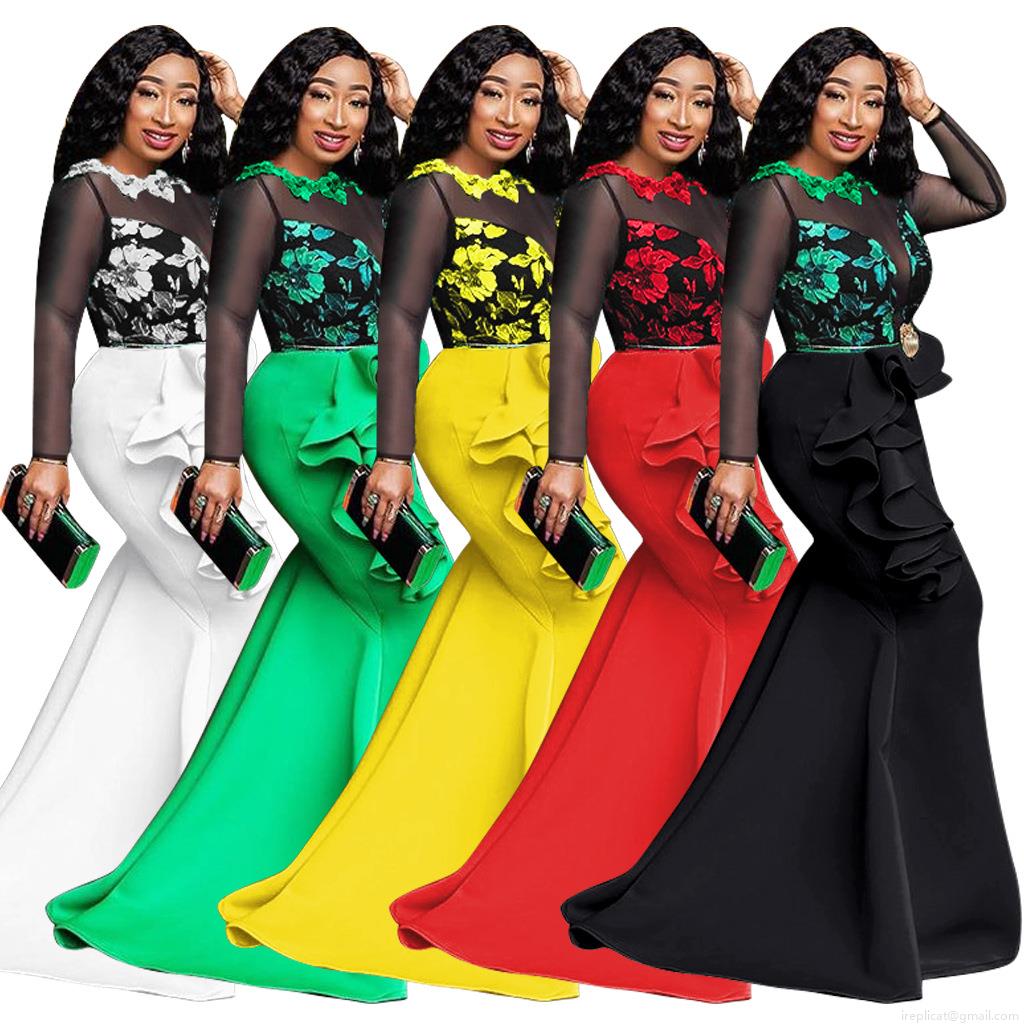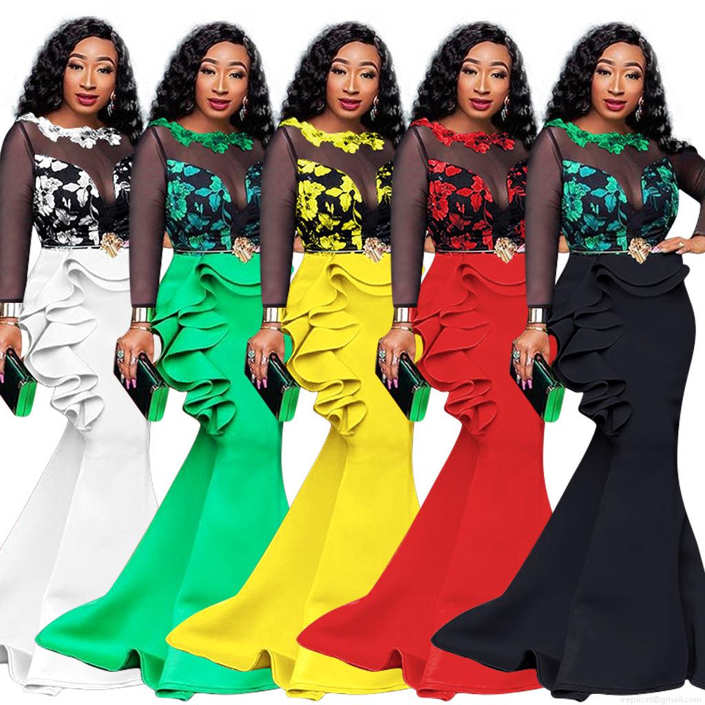 • Women Elegant Mermaid Evening Gown Dress Sexy Sheer Mesh Long Sleeve Embroidery Ruffle Trim Floor Length Party Maxi Dress For Formal Wedding Banquet
