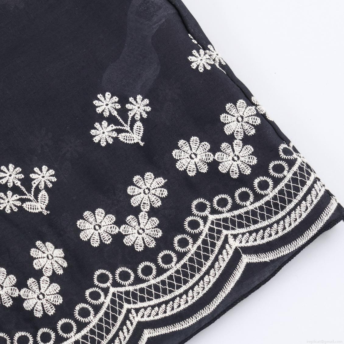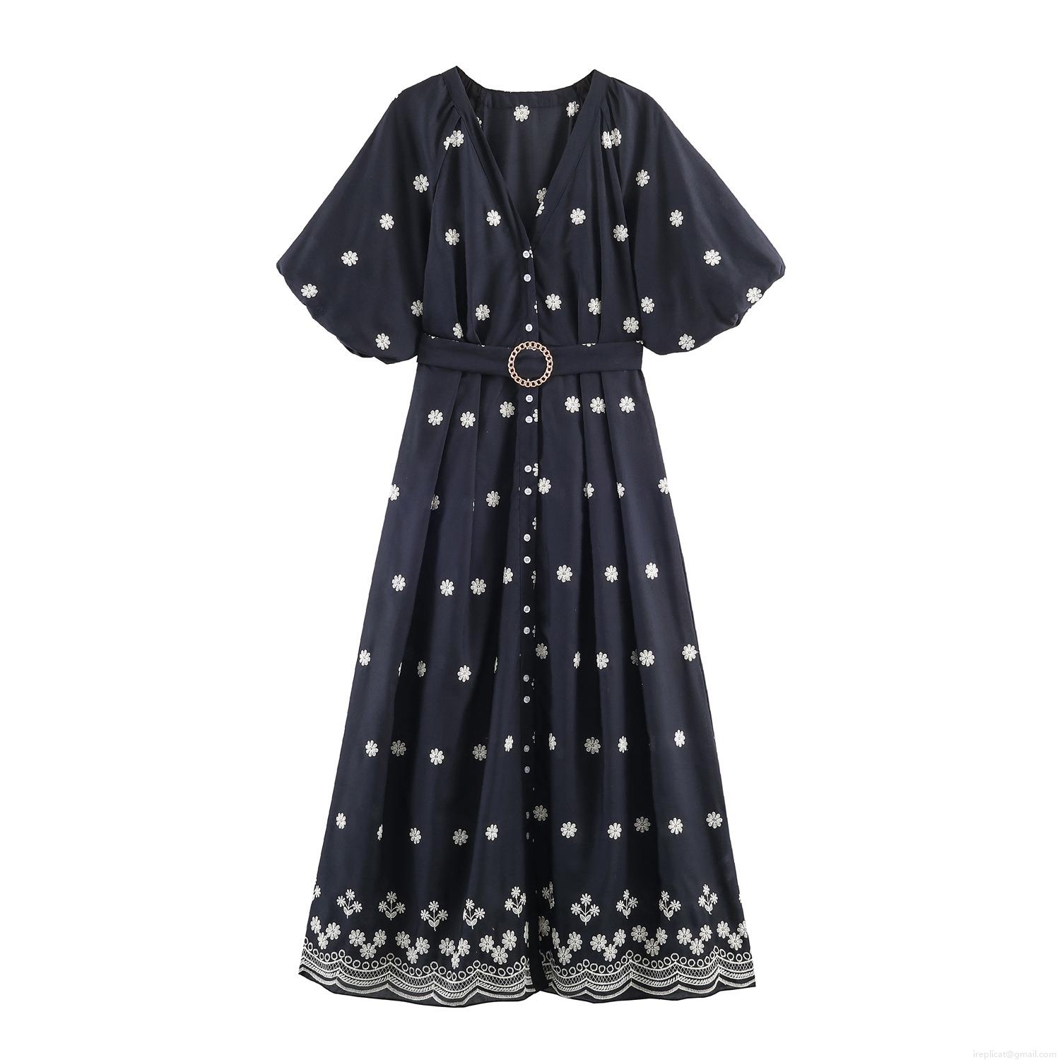 Embroidery, White Flower Embroidery, V-neck, Puff Sleeves, Metal Ring Belt, Wavy Hem