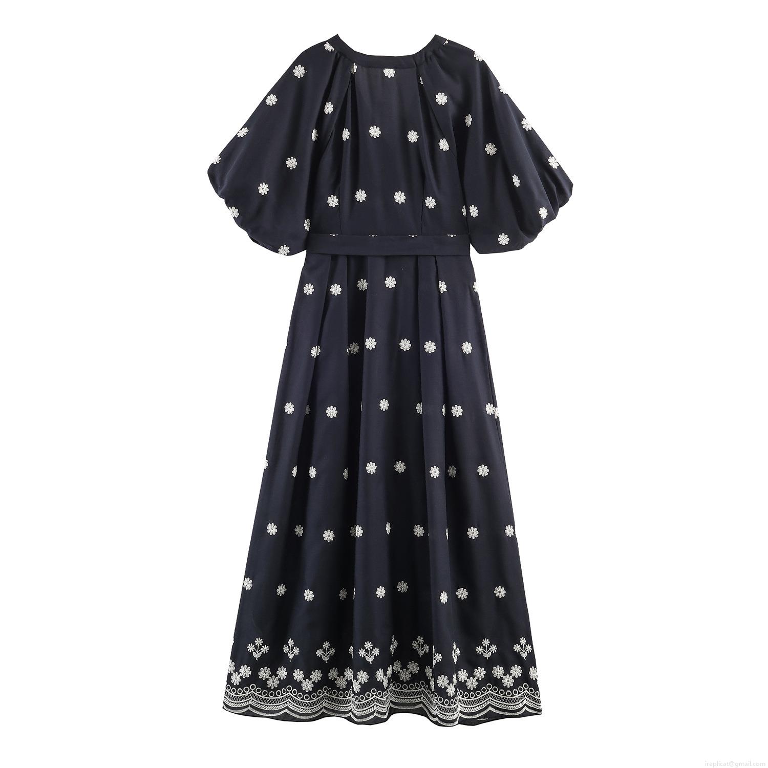 • Women Elegant Navy Blue Floral Embroidered Maxi Dress With Belt V-Neck Puff Sleeve Wavy Hem Polyester Long A-Line Dress For Party Wedding Guest Women