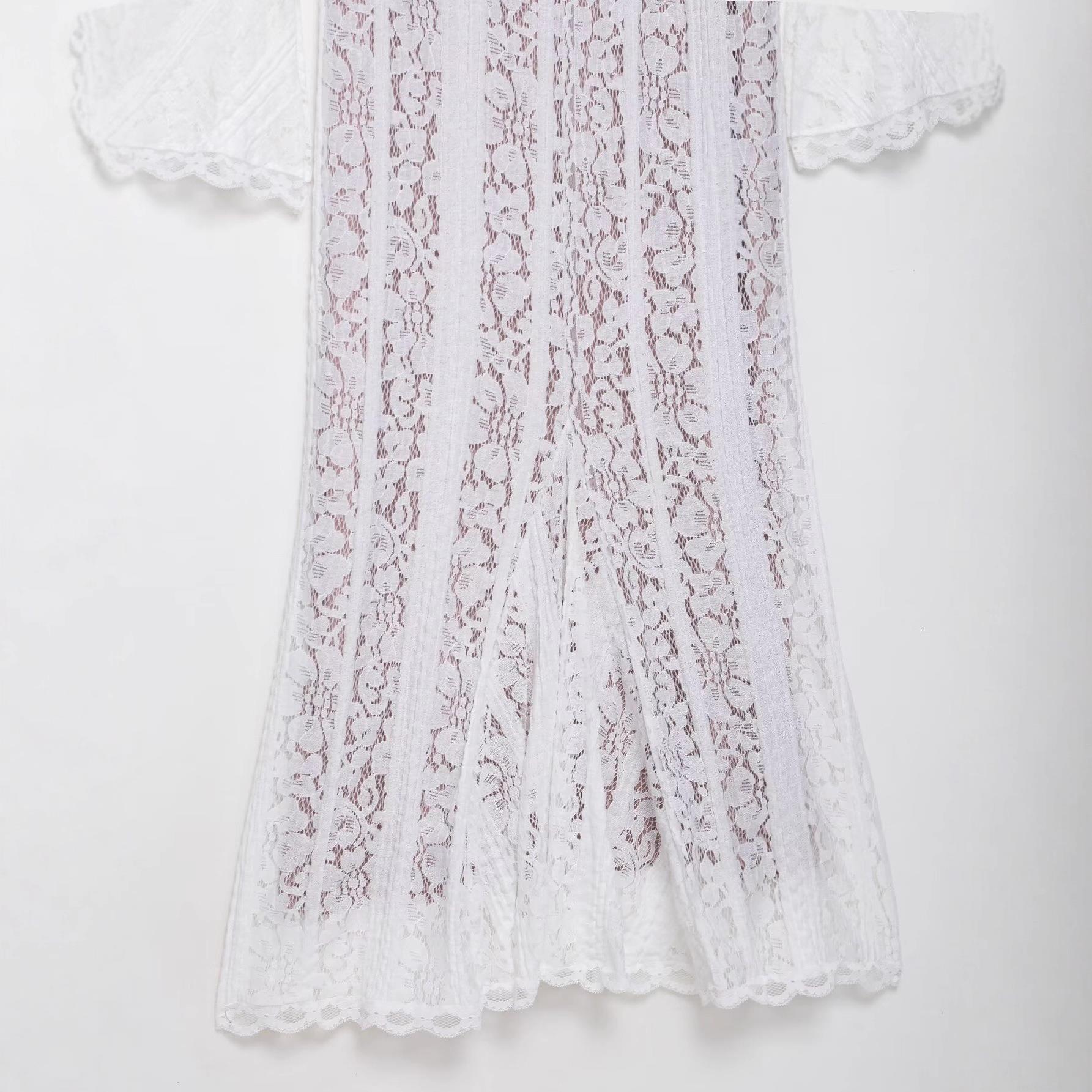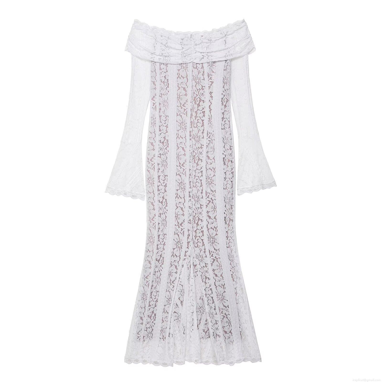• Women Elegant Off Shoulder Lace Maxi Dress Long Bell Sleeves Bodycon Mermaid Party Gown Floral Crochet Slim Fit Formal Evening Dress White Polyester