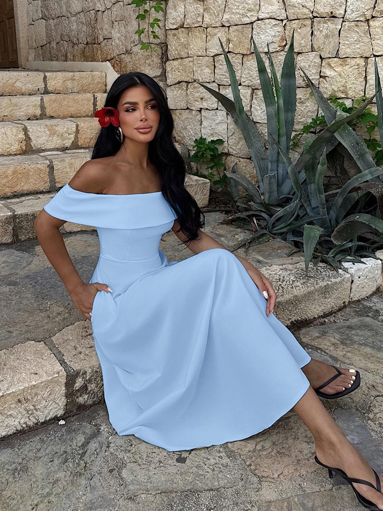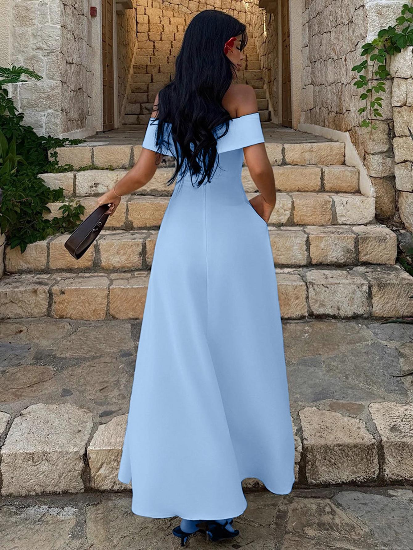 • Women Elegant Off Shoulder Maxi Dress Polyester Spandex A-Line Long Dress With Pockets Solid Color Resort Party Evening Gown For Ladies S-XL