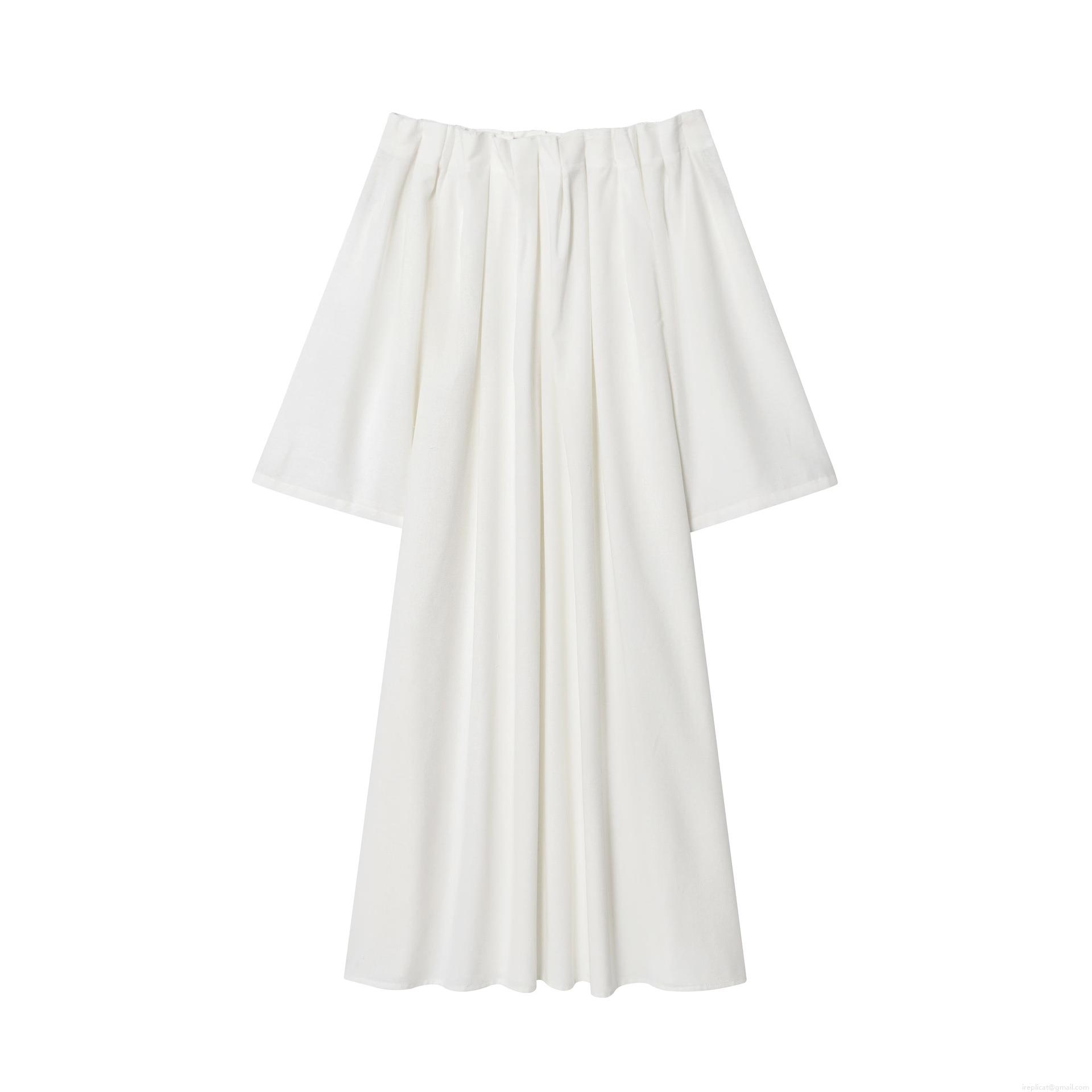 • Women Elegant Off Shoulder Pleated Maxi Dress Solid White Polyester Fairy Style Flare Sleeve Long Dress For Party Vacation Beach
