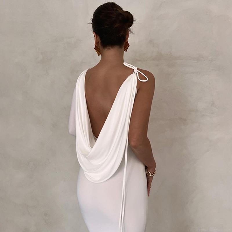 • Women Elegant One Shoulder Long Sleeve Maxi Dress Sexy Backless Cowl Neck Bodycon Fish Tail Polyester Spandex Evening Gown For Wedding Party Gala