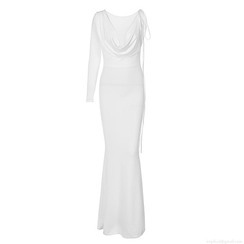 Women Elegant One Shoulder Long Sleeve Maxi Dress Sexy Backless Cowl Neck Bodycon Fish Tail Polyester Spandex Evening Gown For Wedding Party Gala