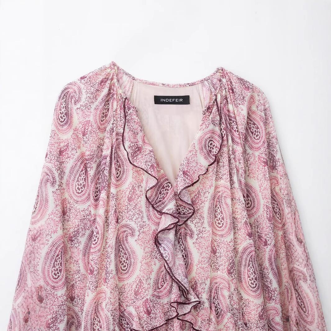 Women Elegant Paisley Print Maxi Dress V-Neck Ruffle Long Sleeve Layered Polyester Chiffon Texture Dress Bohemian Style Flowy Party Evening Long Dress