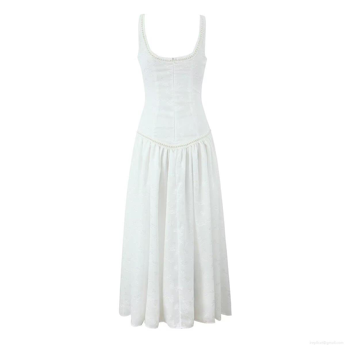 Women Elegant Pearl Decor Spaghetti Strap Maxi Dress Side Slit Backless Jacquard Floral Polyester Slim Fit Long Dress For Party Street Style