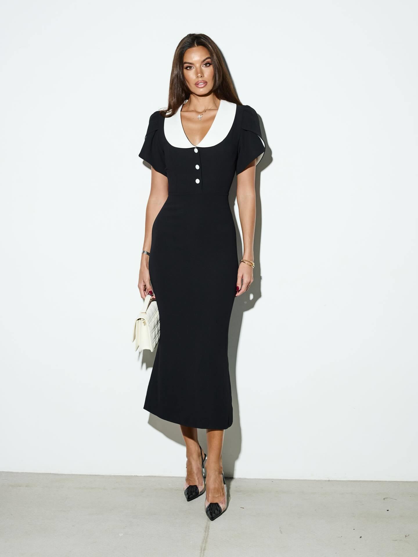 Women Elegant Peter Pan Collar Color Block Maxi Dress Slim Fit Contrast Black White Short Sleeve High Waist Evening Party Bodycon Dress Chic Vestidos