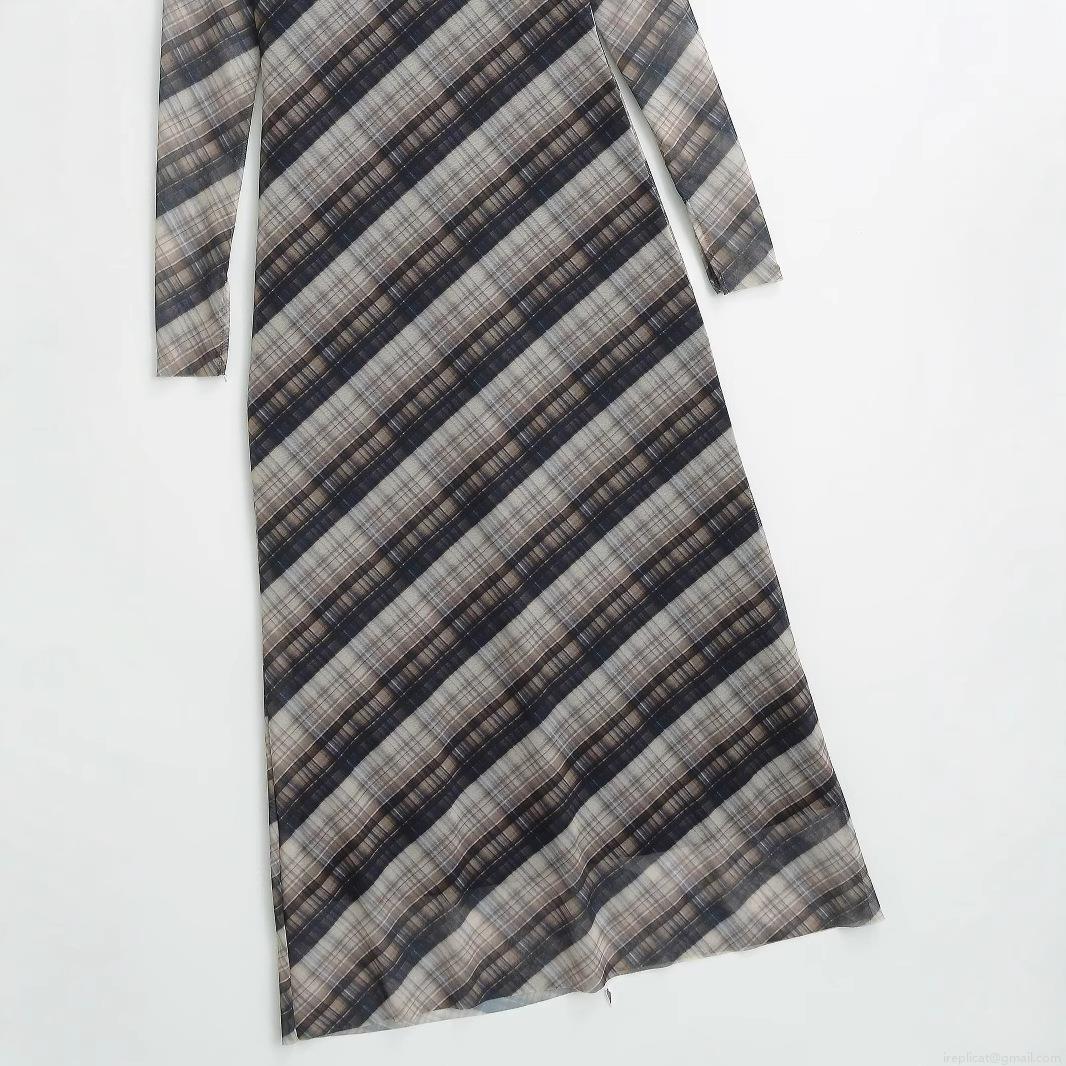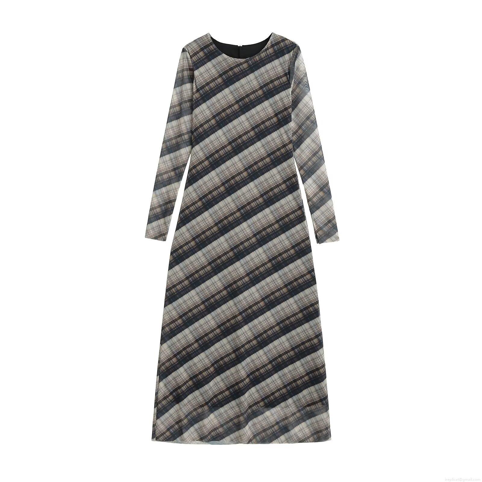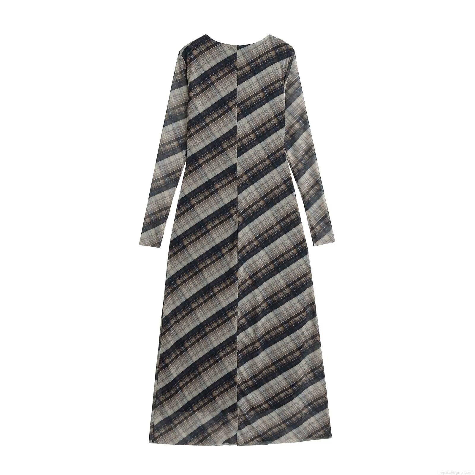 • Women Elegant Plaid Mesh Maxi Dress Long Sleeve Round Neck Sheer Grid Printed Polyester Long Dress For Party Clubwear Socialite Style