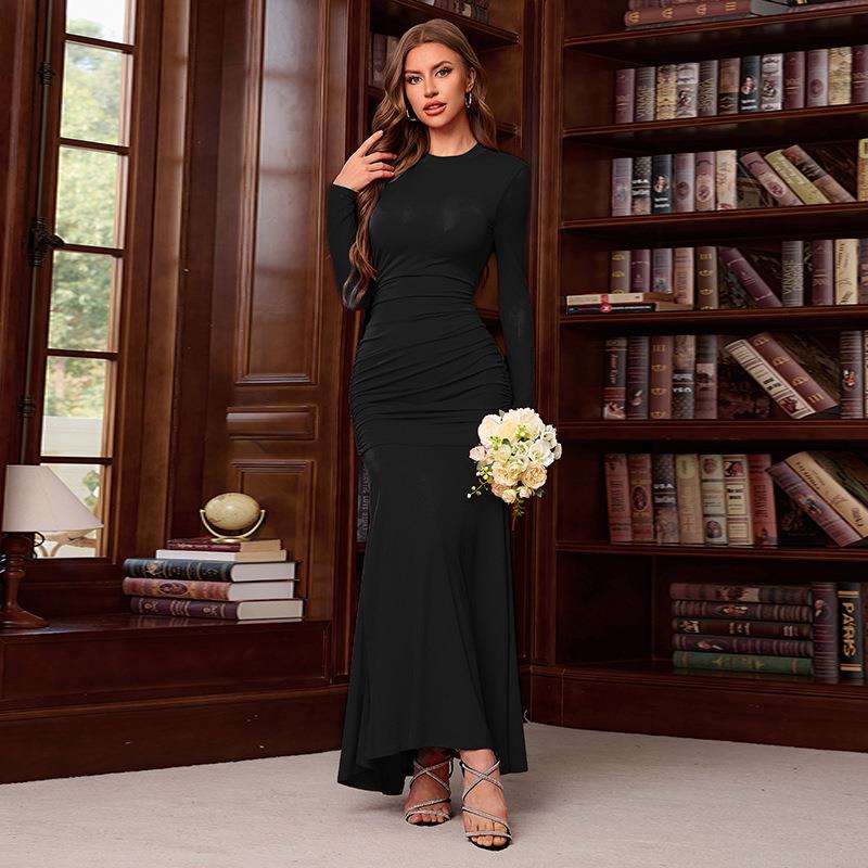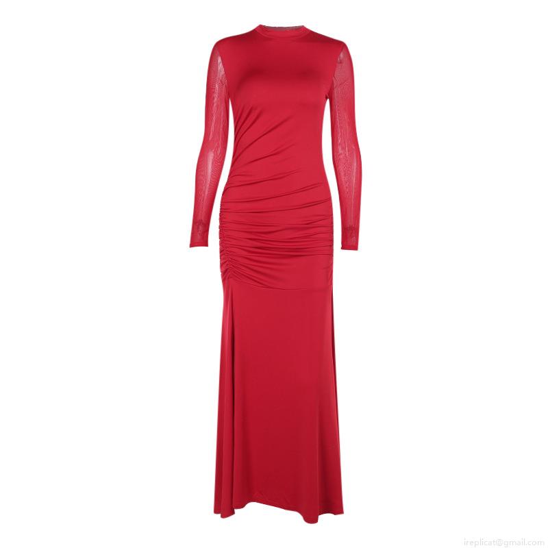 Women Elegant Red Black Maxi Dress Polyester Spandex Mesh Long Sleeve Ruched Fishtail Side Split Evening Wedding Party Slim Fit Bodycon Dress