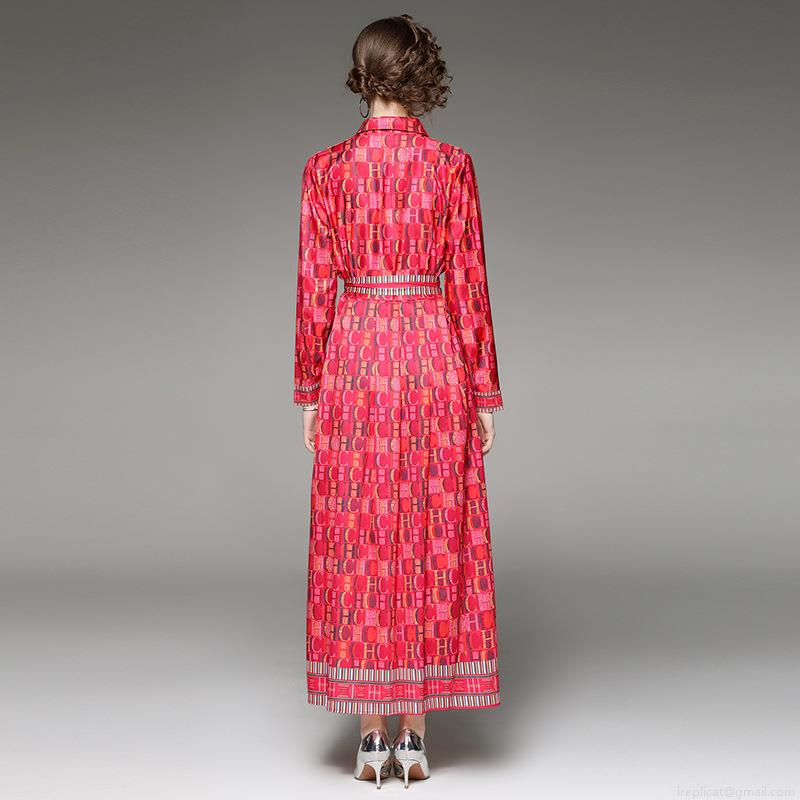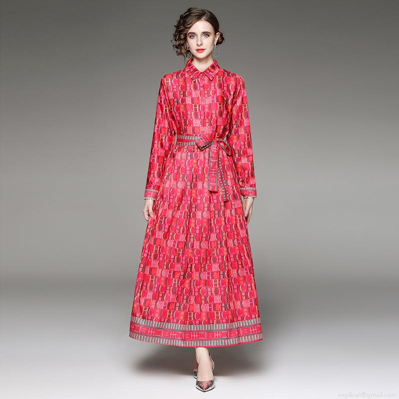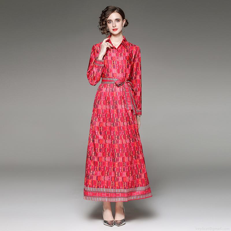 • Women Elegant Red CH Monogram Print Long Sleeve Maxi Dress With Belt Slim Fit Polyester Shirt Collar A-Line Dress For Work Party Ladies