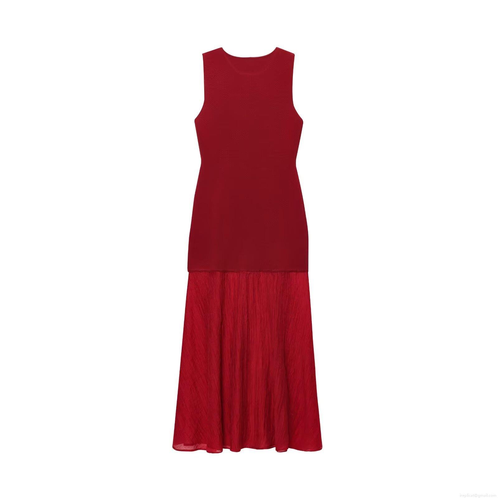 • Women Elegant Round Neck Sleeveless Knit Patchwork Pleated Maxi Dress Solid Color Slim Fit Evening Party Long Dress