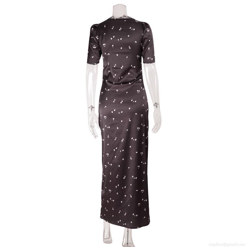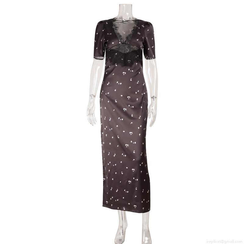• Women Elegant Satin Maxi Dress Lace Patchwork V Neck Hollow Out Floral Polka Dot Print Bubble Sleeve Party Evening Long Gown
