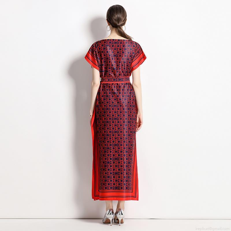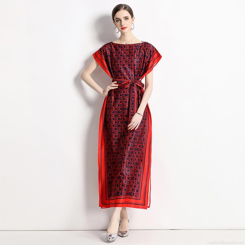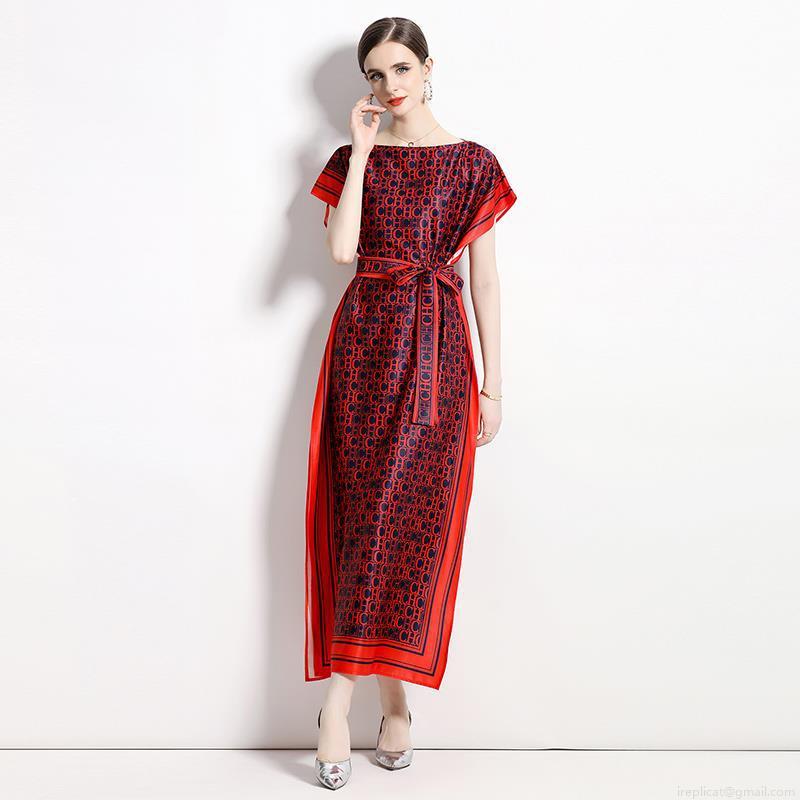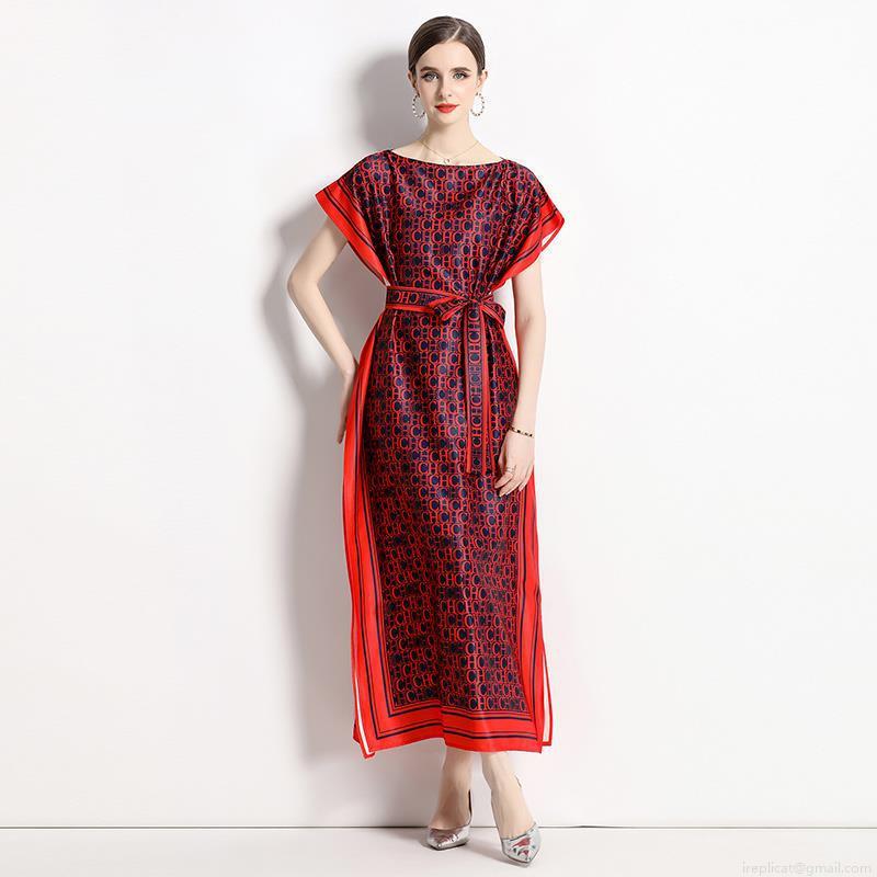 • Women Elegant Satin Maxi Dress With Belt Vintage Monogram Letter Print One Neck Batwing Short Sleeve Long Dress For Party Club Wedding Guest Lady