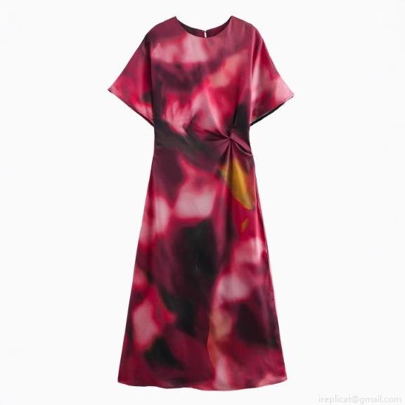 • Women Elegant Satin Print Maxi Dress Short Sleeve Round Neck Waist Knot A-Line Evening Party Dresses Bohemian Geometric Floral Long Dress