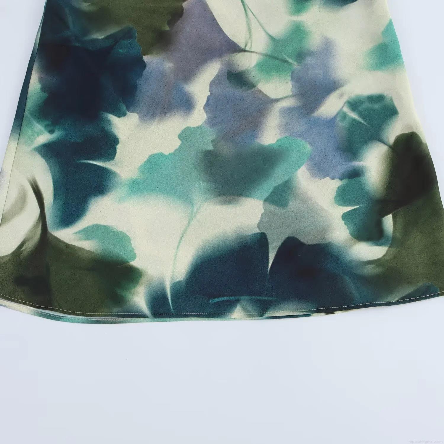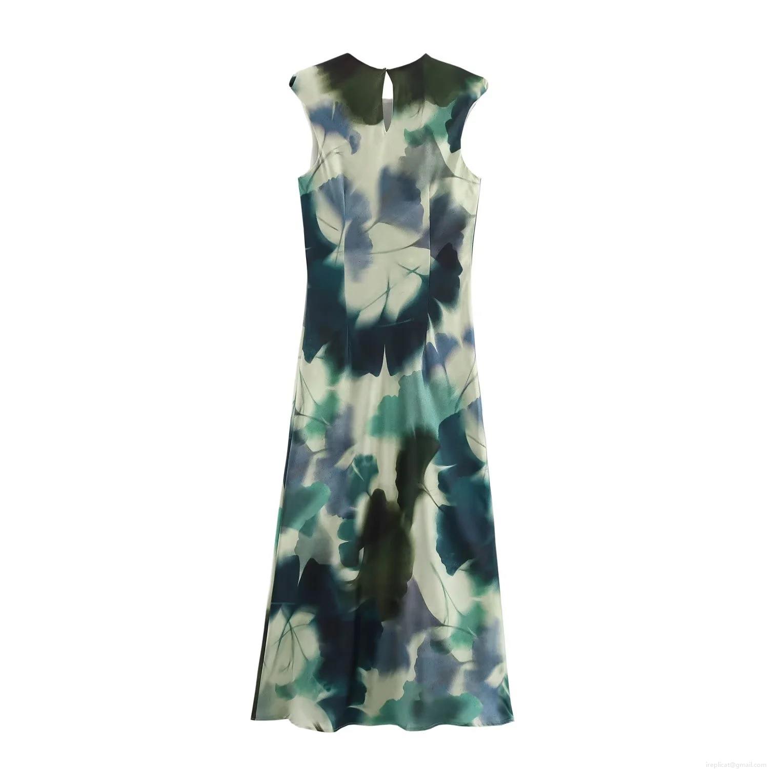 • Women Elegant Satin Texture Abstract Leaf Print Maxi Dress Sleeveless Round Neck Back Keyhole Long Dress For Evening Party Banquet Summer Spring