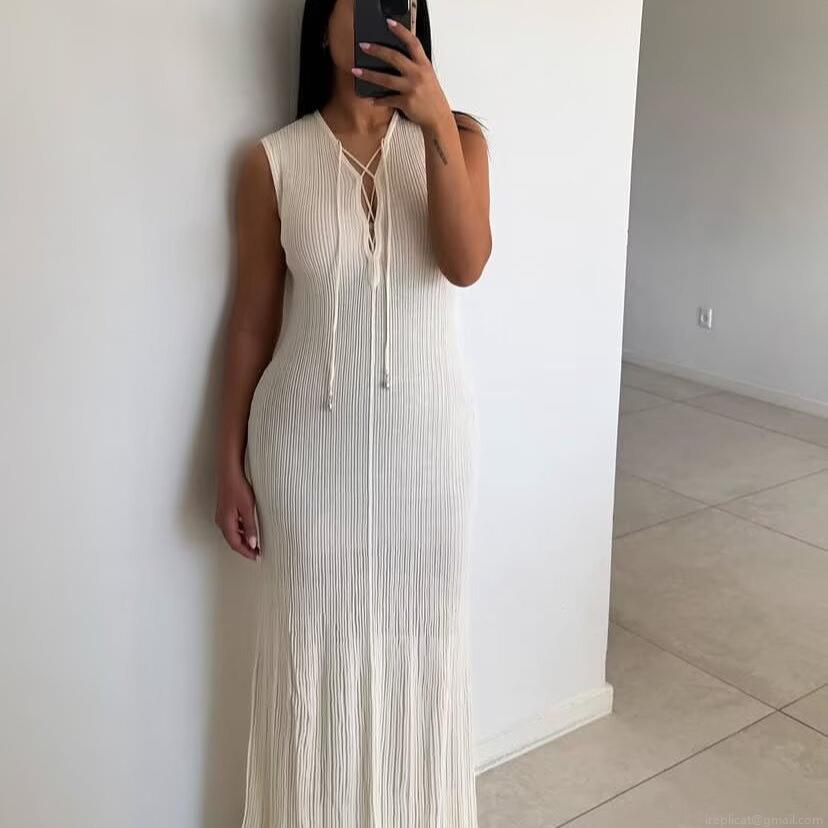 • Women Elegant Sexy Deep V Neck Front Tie Up Sleeveless Maxi Dress Polyester Knitted Ribbed Bodycon Slim Fit Long Dress For Summer Vacation Beach Resort Party