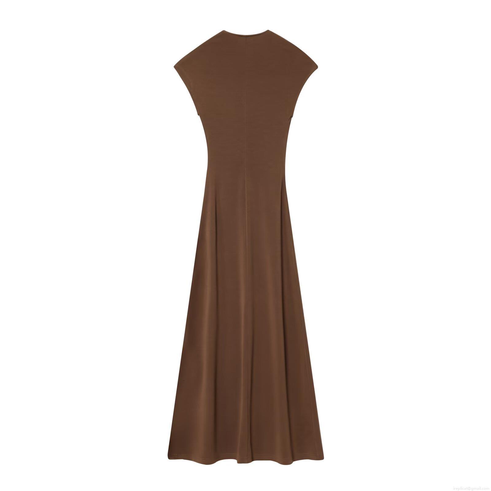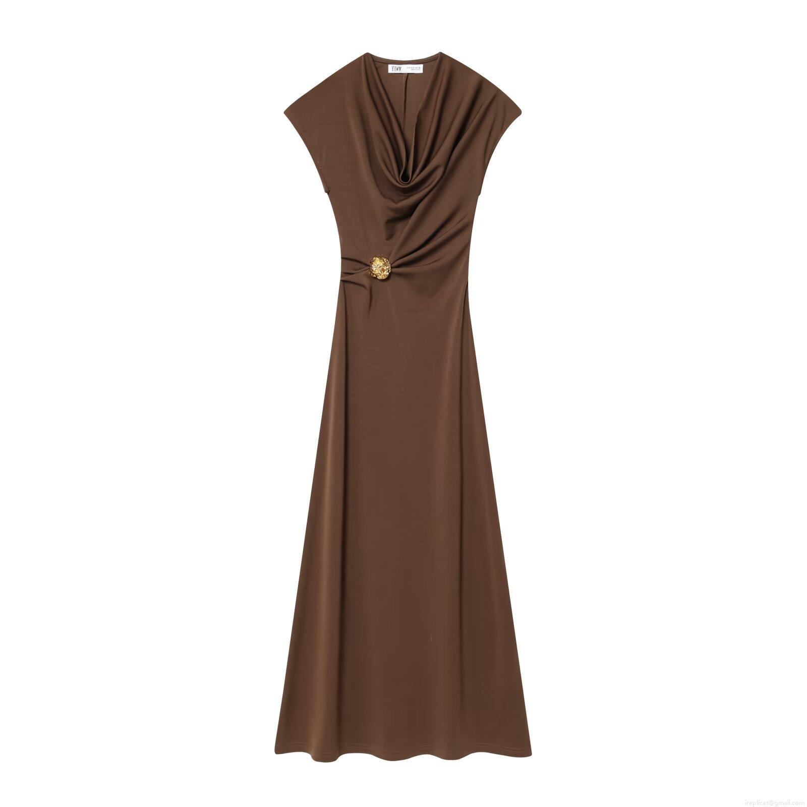 • Women Elegant Sleeveless Pleated Maxi Dress V-Neck Drape Neck Solid Color Slim Fit Evening Party Dress With Gold Metal Buckle