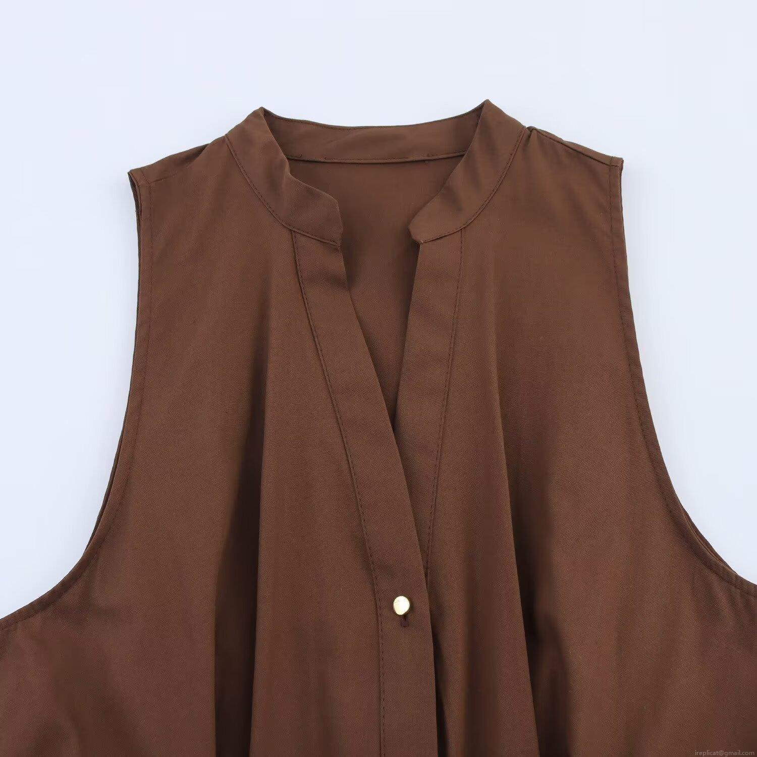 • Women Elegant Sleeveless V Neck Maxi Dress With Belt Gold Buttons Slimming Solid Color Polyester Poplin Dress For Office Daily Party European American Style