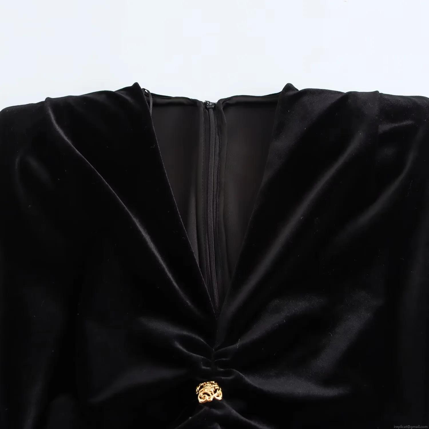 • Women Elegant Sleeveless Velvet V-Neck Maxi Dress Pleated Bodycon Evening Party Long Dress With Gold Decorative Buttons
