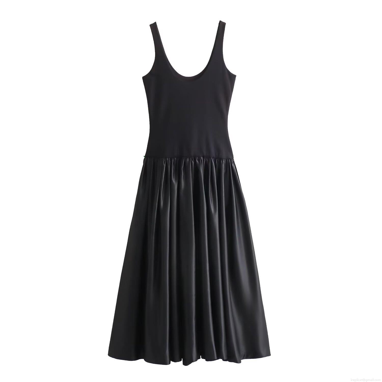• Women Elegant Spliced Maxi Dress Sleeveless U-Neck Knit And Satin Patchwork Evening Party Gown A-Line Long Dress For Ladies